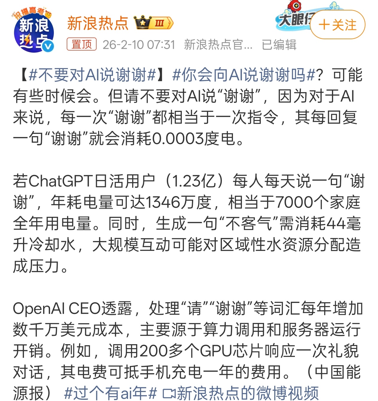 不要对AI说谢谢这个话题过于莫名其妙了,省电居然能省到简单的AI交互上来,再去打