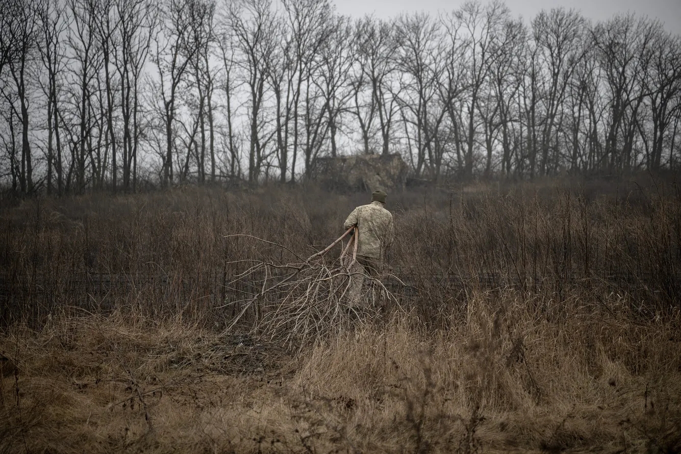 一名乌克兰士兵正在收集木柴来烤火,这个天气实在是冷得很。