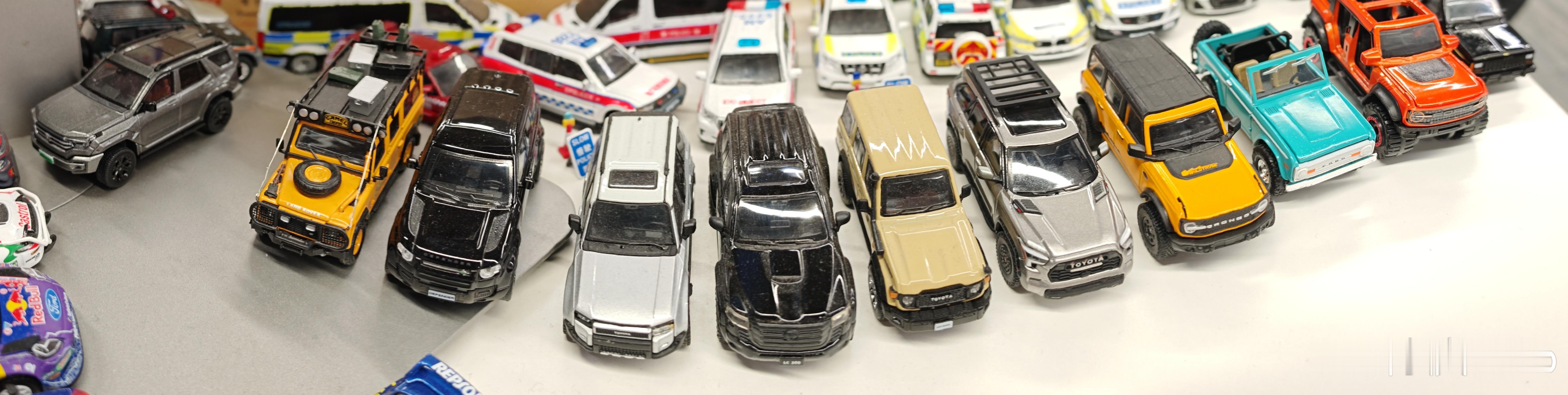 同事的桌面车库(硬派越野爱好者),左边第二个位置空了一辆,猜猜他要摆一辆什么车?