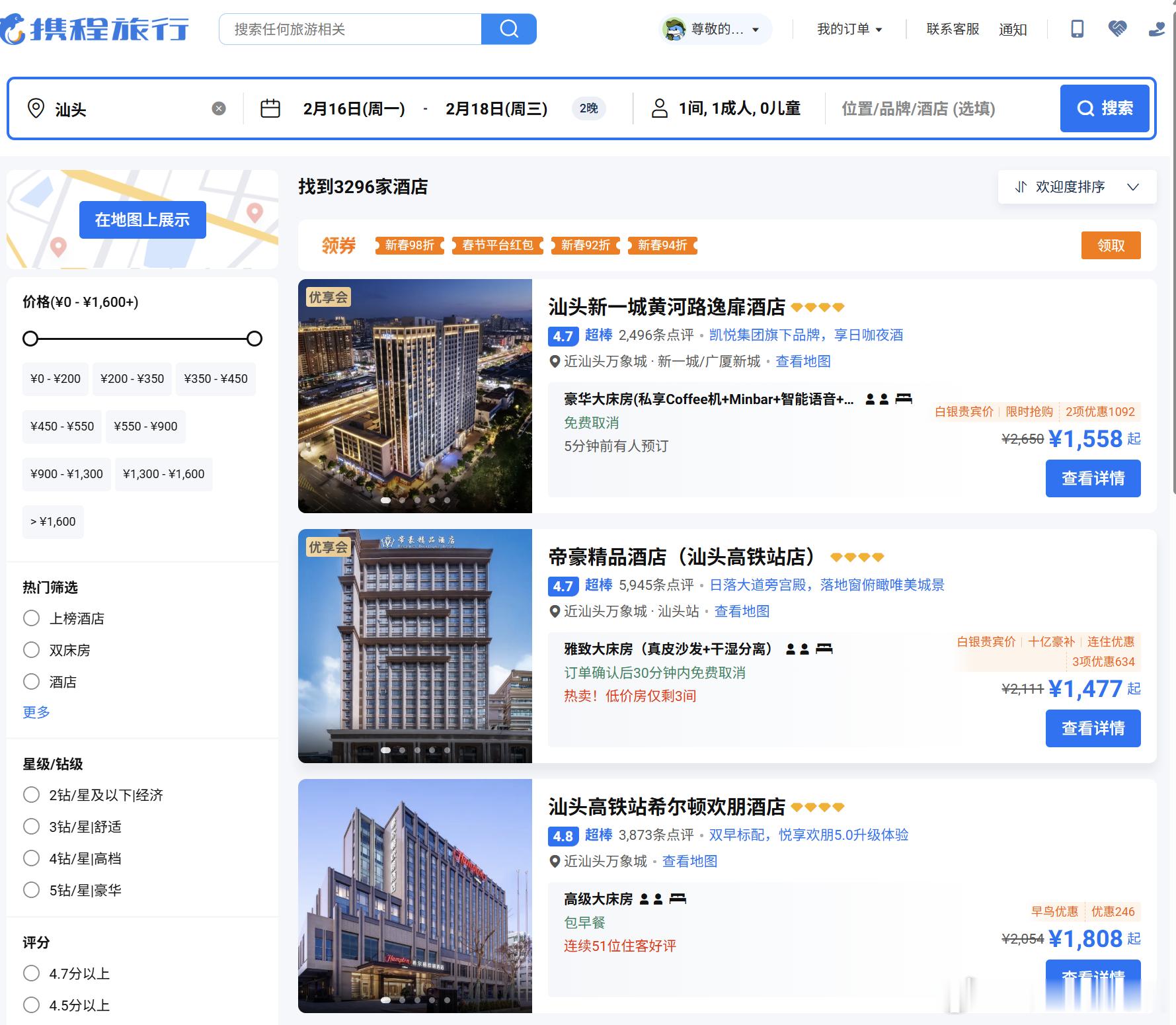 汕头亚朵酒店春节一晚4200 看来是就准备挣春节这一波了,就连希尔顿欢朋这种级别的都已经1800元一晚了