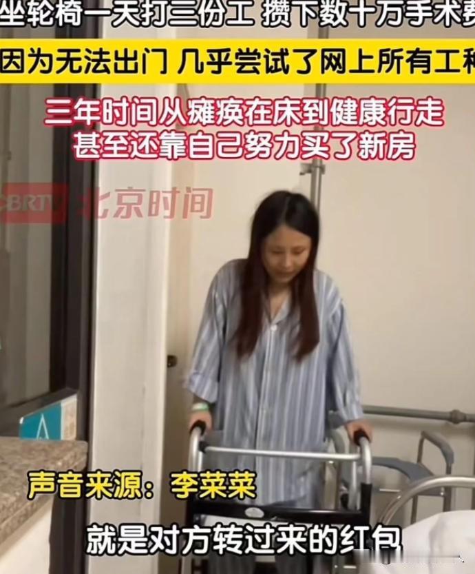 2021年,浙江一95后女子不幸患上骨髓炎,瘫痪在床,向父母求助,谁知,父母竟冷淡地说:“我们哪有能力帮你,你弟还没结婚呢。”然而,女孩并没有放弃自己,为了站起来,她在700个日夜里做了件事,结局却让人泪目。 麻烦各位读者点一下右上角的“关注”,留下您的精彩评论与大家一同探讨,感谢您的强烈支持! 2021年秋天,26岁的浙江姑娘李菜菜拿到一纸诊断书,“慢性骨髓炎”几个字冰冷刺眼。 医生解释说,这病侵蚀骨头,疼痛剧烈且易复发,治疗艰难。 更深的寒意来自她最亲近的人。 相恋四年的男友在电话那头沉默后选择离开,而老家父母的回应更为决绝。 他们担忧疾病“传染”,更强调家中积蓄需留给弟弟结婚,明确表示无力也无意提供帮助。 顷刻间,疾病、情感与亲情的支撑几乎同时崩塌。 李菜菜躺在月租低廉、墙皮剥落的出租屋里,被剧痛和孤立无援的绝望笼罩。 然而,在漫长无助的几天后,手机里一声网店订单的提示音,像黑暗中擦出的一星火花。 她意识到,能依靠的只剩自己。 她购置了一辆二手轮椅,自此开启了一场孤独而倔强的生存之战。 为了筹集高昂且持续的治疗费用,她将自己逼至极限。 白天,她坐在轮椅上处理客服与文案工作; 深夜,忍着疼痛学习视频剪辑,经营自己的小网店。 供货商在无电梯的老楼五层,她便把轮椅停在楼下,依靠手臂力量和完好的那条腿,忍着钻心疼痛,一级一级攀爬楼梯,取回货物。 每一个包裹的打包寄出,背后都是常人难以想象的艰辛。 最痛苦的是术后或病情加重时,连起身喝水、挪去卫生间都成为巨大考验。 但她在网络上呈现的,并非血泪的控诉。 她开设名为“重生日记”的社交账号,记录的多是琐碎而明亮的生活片段: 一缕照进窗户的阳光,一笔小小的订单收入,一段剪辑视频的成就感。 她以笑容面对镜头,分享康复练习中跌倒又爬起的日常。 这份在逆境中顽强生长的生命力,逐渐吸引了数十万陌生人的关注与鼓励。 这些温暖的留言成为她重要的精神支撑,也有好心人提出经济援助,大多被她婉拒,她更希望凭借自己的双手挣取医疗费。 她的目标明确: 攒钱进行一次次犹如“刮骨疗毒”的手术。 骨髓炎治疗需要反复清除坏死骨组织,每次手术都风险重重。 特别是最后一次关键手术前,医生坦诚告知成功率可能仅四分之一,失败则意味着可能永久依赖轮椅。 听完这一切,李菜菜依然在知情同意书上签下了自己的名字。 对她而言,哪怕希望渺茫,也值得用全部勇气去争取。 手术后的康复之路同样漫长而痛苦。 从卧床到被人搀扶站立,再到借助器械艰难迈步,每一毫米的进展都伴随着汗水和刺痛。 她日复一日进行枯燥的康复训练,对抗着肌肉萎缩与身体的无力感。 终于,在一个术后清晨,她第一次不依靠外力,独自稳稳地站立起来。 那一刻的复杂心绪,化作止不住的泪水,其中包含的不只是辛酸,更是超越苦难后的释然与自豪。 凭借不懈努力与网络带来的些许机遇,她的小网店逐渐发展,后来得以组建一个小团队。 数年后,她在杭州攒够首付,拥有了属于自己的小家。 她将陪伴自己多年的旧轮椅仔细擦拭,留作一段生命的纪念。 她甚至将自己的名字从“菜菜”改为“彩彩”,寓意为自己的人生重新描绘色彩。 如今,她的“重生日记”更多转向分享创业经验与心理感悟,致力于鼓励和帮助其他身处困境的人。 李菜菜的故事,始于重病与背叛的双重绝境,却终于一场个人力量与坚韧意志的胜利。 她没有屈服于命运的骤变,而是在无人依靠的绝境中,用七百多个日夜的坚持,摇着轮椅一寸寸为自己开辟出生路。 她的经历或许无法提供普适的成功法则,却清晰印证了一个朴素道理: 当外在支撑悉数撤离,一个人内心不熄的求生欲与行动力,往往能迸发出照亮自身、乃至温暖他人的光芒。 主要信源:(澎湃新闻——700多天5次大手术!“95后”女孩拍“重生日记”:我在等逆风翻盘)