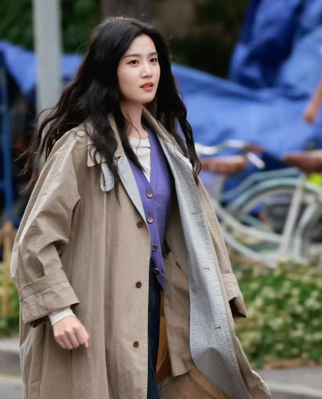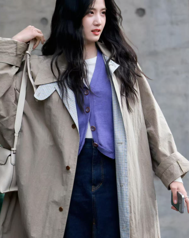 卢昱晓私服卡其风衣+紫色马甲+牛仔半裙,减龄又高级!