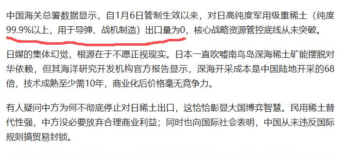 中国居然还继续在向日本出口稀土产品,似乎有点让人觉得意外。 日本右翼觉得这是他们外交的伟大胜利。 但是一看内容——真正有用的稀土,他们得到的数量是——0。是零呢。 普通的稀土就和普通商品一样,没有特别价值。 只有个别稀有元素的高纯度产品,才有高价值。 也只有这一部分才能真正用于高精尖科技的产品中。 他们现在是无论如何也没有办法提纯到产品需要的水平。 我们禁的就是这一部分。 稀土不稀罕,但是我们的提纯技术独一份,这才是关键。 就像芯片一样。 普通芯片,很多国家都能生产,但2纳米的就只有极少数企业能生产。 要卡就是卡这一部分。 现在还没有到和日本完全断交的程度,所以生意该做还是会做,但是战略资源它是不会得到的。 点右上角关注我,我们一起去看过个魔幻的世界