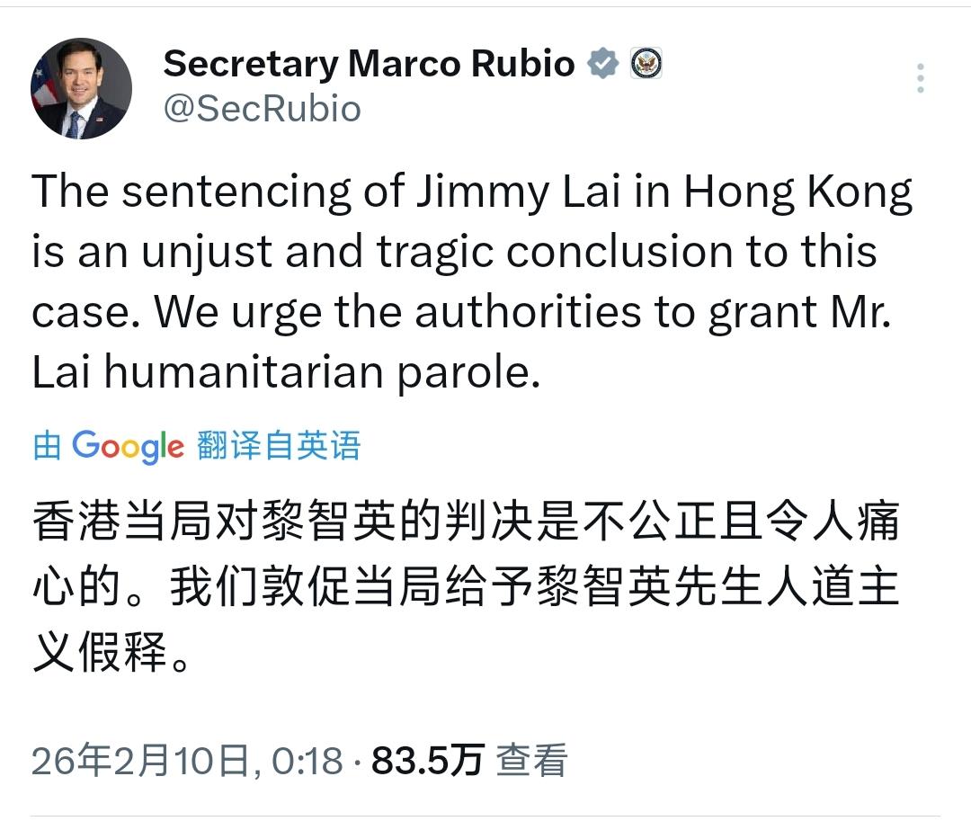 鲁比奥彻底急眼了!就在今天,这位美国国务卿在社交媒体上歇斯底里地咆哮,要求立刻放人。但一切都已经太晚了,香港的法槌已经重重落下,二十年监禁就是最终答案,美国人的面子这次彻底不好使了。 美国国务卿卢比奥今天(2月10日)发文说:“黎智英在香港被判刑,是此案不公正且令人痛心的结局。我们敦促有关当局给予黎智英人道假释。” 这番话听起来冠冕堂皇,实际上就是赤裸裸的干涉和无能狂怒。 稍微了解香港法律的人都知道,香港根本就没有所谓的 “人道主义假释” 制度。 按照香港的法律规定,服刑满三分之一、表现好、评估没有风险,才可能进行复核,而黎智英刚被判入狱,一天刑期都还没服,谈何假释? 鲁比奥连香港的法律制度都没搞清楚,就随便发表言论,显然是站不住脚的。 而且鲁比奥说判决不公正,却从来没指出哪条证据错了、哪个程序违法了。 相反,法院的判决书里把黎智英的微信记录、银行流水,还有他通过 “重光团队” 收受 510 万港币,以及怎么联系美国议员的情况都写得明明白白。 他自己在去年十二月的听证会上还说黎智英 “代表新闻自由”,可实际上黎智英的行为根本不是什么新闻自由,而是勾结外国势力危害国家安全,这是任何一个国家都不能容忍的。 美国方面一直拿人权说事,可他们自己的 FBI 监控德国总理、NSA 偷听全球电话,却半个字不提。 现在反而对香港法院依法审理的案件指手画脚,这明显就是双重标准。香港是中国的香港,香港事务纯属中国内政,任何外部势力都无权干涉,这是国际法原则和国际关系基本准则的明确要求。 之前美国就多次干涉香港事务,比如发布所谓的 “香港政策法报告”,还对中国中央政府驻港机构和香港特区政府的官员实施 “制裁”,这些行为都遭到了中国外交部驻港公署的强烈谴责和坚决反对。 外交部驻港公署发言人明确表示,美方的这些做法是对香港事务和中国内政的粗暴干涉,是对国际法原则和国际关系基本准则的粗暴践踏,暴露了美国霸权霸道的丑恶嘴脸。 鲁比奥这次跳出来发声,说白了就是赤裸裸的干涉中国内政,也是一种无能狂怒。 他老家佛罗里达州的柑橘出口对华已经跌了 11%,之前因为这个他还一度不吭声,现在又跳出来炒热度,显然不是真的关心司法公正,而是想配合华盛顿的一些人制造话题,插手香港事务。 可不管他怎么喊,都改变不了已经生效的判决结果。香港监狱管理局也明确回应,没有 “人道主义假释” 这一制度,鲁比奥的要求根本就没有任何法律依据。 这些年,香港国安法和香港国安条例的制定实施,还有香港选举制度的修改完善,堵住了香港维护国家安全的法律漏洞,让香港的局势逐渐稳定下来。 2025 年香港的 GDP 涨了 3.2%,比疫情前还稳定;2026 年一月国际机构评的营商信心指数是 87.4 分,五年来最高。 老百姓照常上班、开店、上学,没有谁因为黎智英案不敢说话,也没有谁因为国安法不敢创业,安全和正常生活根本不矛盾。 鲁比奥的这番言论,不仅改变不了黎智英被判 20 年监禁的事实,反而让更多人看清了美国干涉中国内政的真实面目。 香港的司法是独立的,判决是基于事实和法律作出的,不会因为外部势力的叫嚣就有所改变。 任何企图分裂国家、危害国家安全的人,不管背后有谁撑腰,最终都必将受到法律的严惩;任何外部势力干涉香港事务、干涉中国内政的企图,也注定会失败。