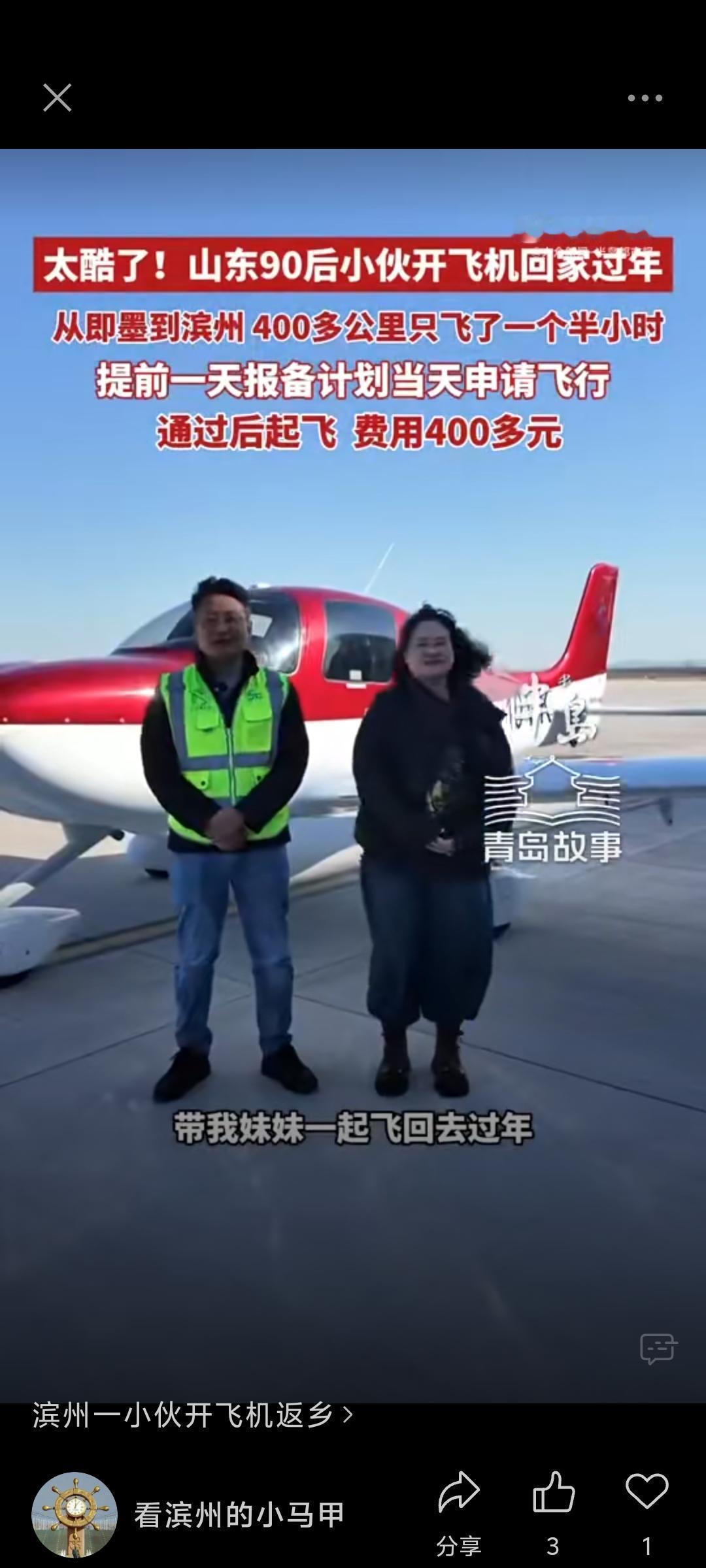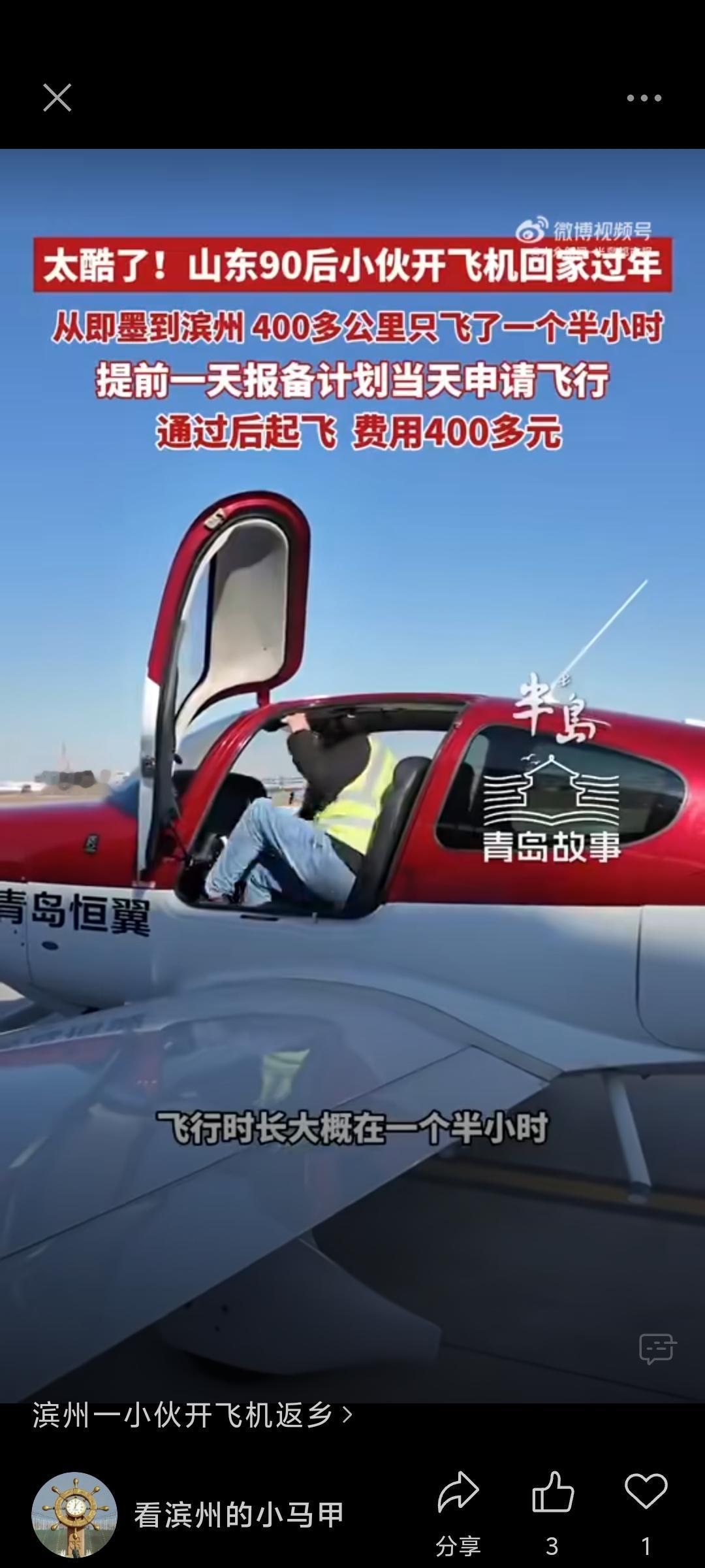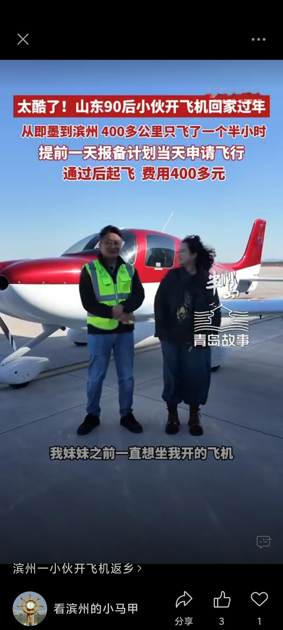 滨州一小伙开飞机返乡 2026年春节,山东滨州90后飞行教员刘浩亮驾驶飞机从青岛即墨返回滨州,飞行约1.5小时,比开车节省近半时间,400多公里路程油费仅400多元,还顺带表妹一同返乡,引发广泛关注。 这一现象背后,是我国低空经济的快速发展。近年来,国家大力支持低空经济,空域申请流程简化,全国已建成263处起降点、37条获批航线,小型飞机门槛与成本不断降低,吸引飞行教员等群体率先尝试。湖南、安徽、山东日照等地也出现类似驾机返乡案例,低空出行正从小众玩法走向现实应用。 2026年被称作低空经济“法治化元年”,新修订的《民用航空法》即将实施,未来还将建设更多起降点,构建“空中公交”网络。不过,飞机保养、保险等隐性成本较高,目前低空出行仍以航空从业者为主,要真正普及到普通民众,仍需进一步发展。 综合 看滨州 半岛都市报等