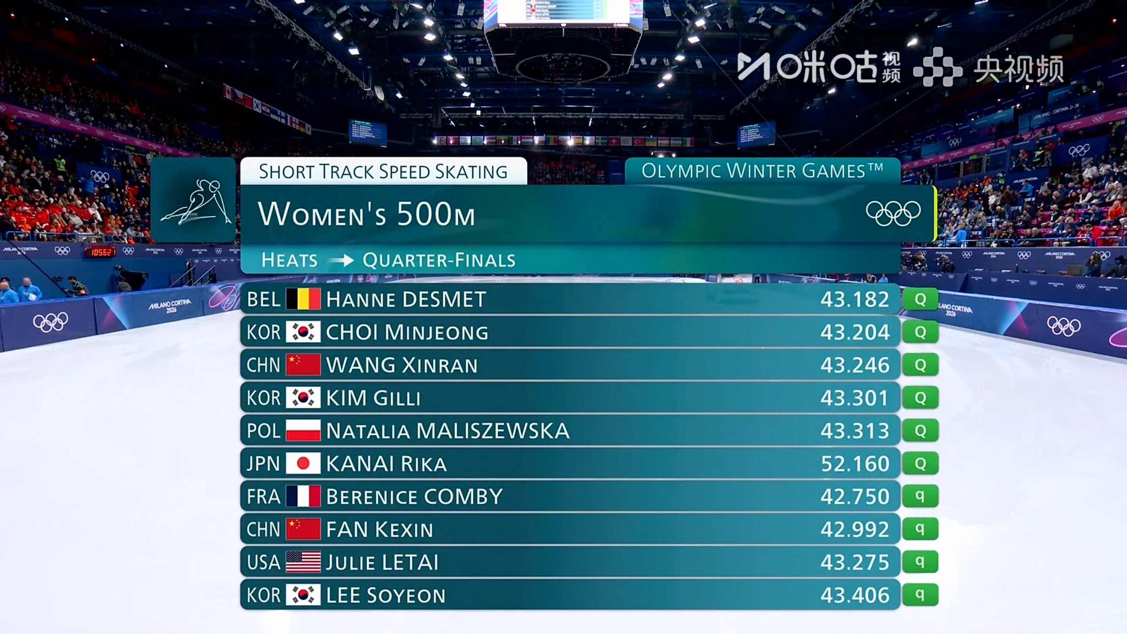 女子短道速滑500米预赛 三位中国选手王欣然、张楚桐、范可新全部顺利晋级下一轮米兰冬奥会