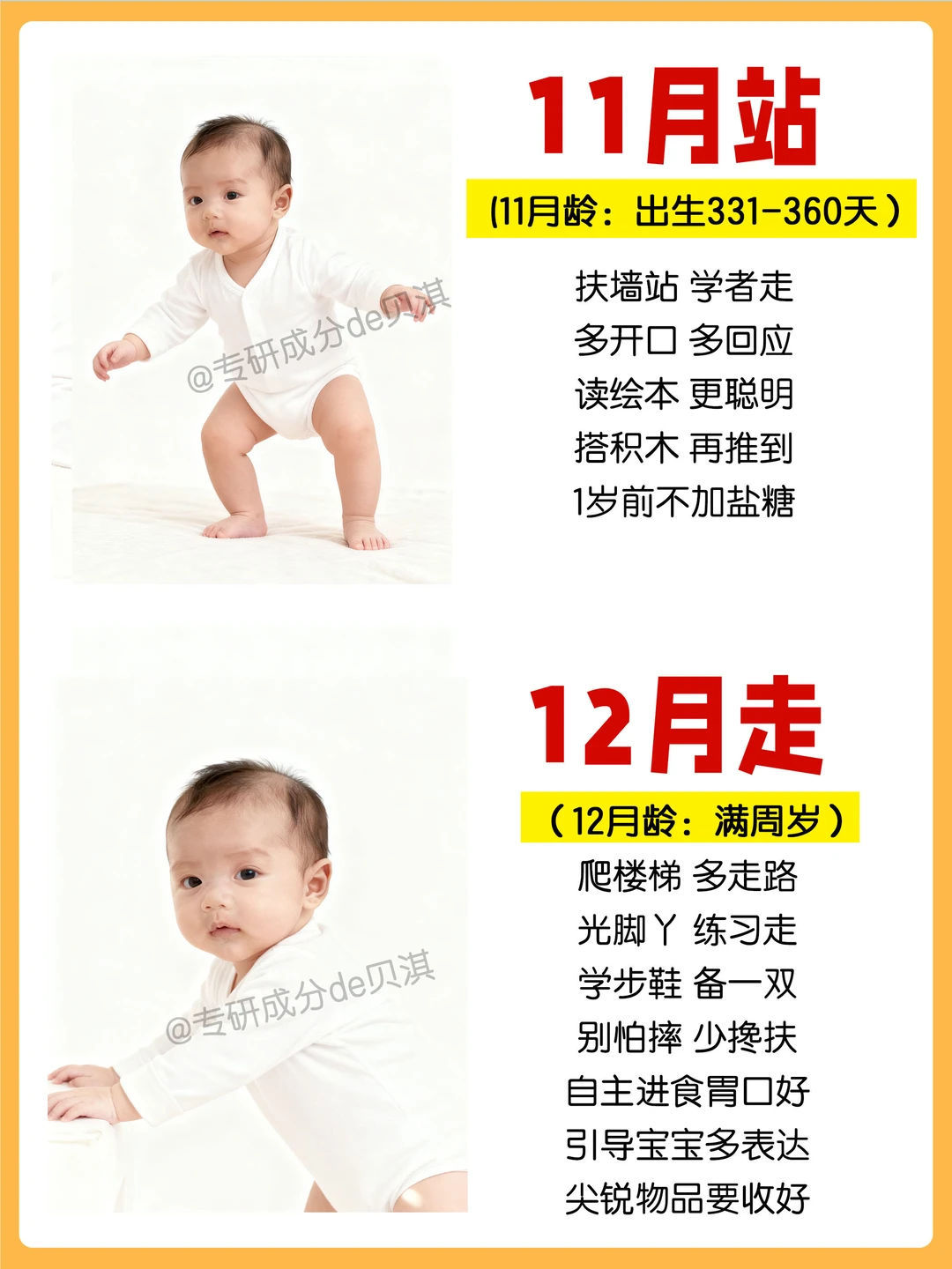 只要记住宝宝0-12月成长口诀, 你就会发现[向右R]只要顺应月龄规律发展去带养, 宝宝真的会好带很多! 快来自查你家宝宝达到标准了没? 一月睡 二月闹 三月抬头 四月翻身 五月出牙 六月辅食 七月坐 八月爬 九断夜奶 十学语 十一月站 十二月走 赶紧转给老公、婆婆👵收藏好,带娃不用手忙脚乱啦~
