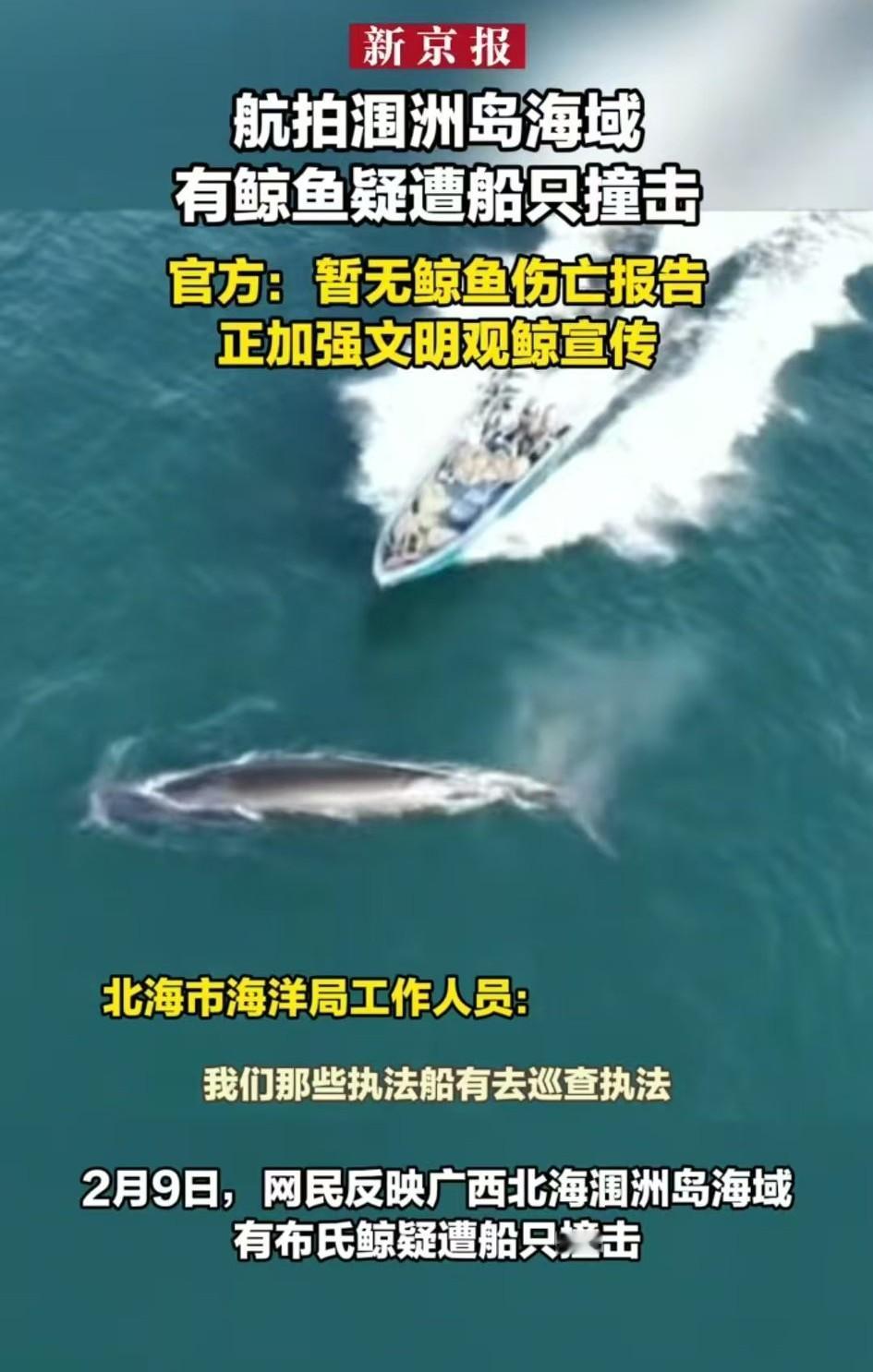 布氏鲸“刀疤哥”被渔船撞到,官方说暂无鲸鱼伤亡报告。 根据有关规定,渔船或其他船舶进入涠洲岛鲸鱼活动点300米范围内,船只必须开始减速,航速不得超过约9.2㎞/h,严禁船舶主动驶入鲸鱼100米范围内。 鲸鱼被撞,一是会给它们带来致命伤害,而这种伤害不一定马上显现出来,或重伤鲸鱼沉入海底发现不了。 二是鲸鱼也是有智商的,多只同类在同一区域被撞,其他鲸鱼以后恐再也不来涠洲岛,到时候怎么还能再靠观鲸带来过亿的旅游年收益呢?! 可怜的“刀疤哥”,愿你无恙!