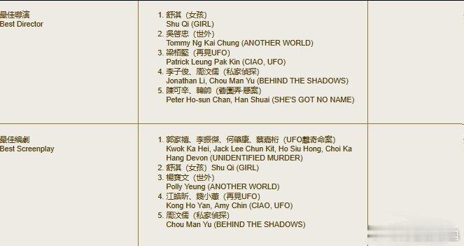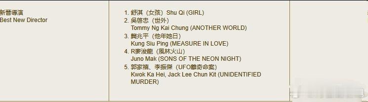 新晋导演:龚兆平《他年她日》吴启忠《世外》郭家禧、李振杰《UFO离奇命案》麦浚龙《风林火山》舒淇《女孩》