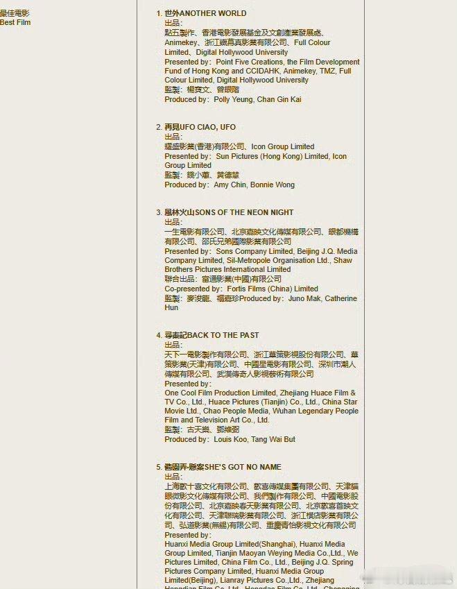 最佳电影:《世外》《再见UFO》《风林火山》《寻秦记》《酱园弄‧悬案》
