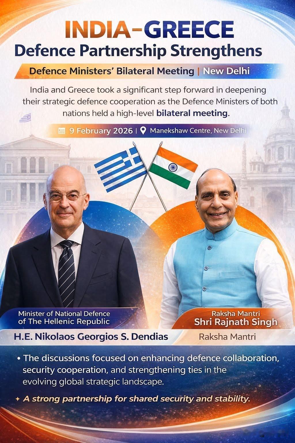 2026年2月9日,印度国防部长拉杰纳特·辛格(Rajnath Singh)与希腊国防部长尼古拉斯·乔治·登迪亚斯(Nikolaos-Georgios Dendias)在新德里马内克肖中心举行了双边会谈,旨在加强两国间的国防工业伙伴关系。 以下是此次会谈的主要成果: 签署国防合作联合意向声明:双方签署了一份关于加强国防工业合作的联合意向声明,这被视为制定两国国防伙伴关系五年路线图的起点。该声明旨在将印度的“自力更生印度”(Aatmanirbhar Bharat)倡议与希腊的“2030议程”国防改革相结合,扩大各自本土国防工业的能力。 交换2026年军事合作计划:两国部长交换了《2026年双边军事合作计划》(BMCP),为两国武装部队之间的军事交流、联合演习和培训项目奠定了框架。 加强海事安全合作:希腊宣布将在位于古鲁葛拉姆的印度洋地区信息融合中心(IFC-IOR)派驻一名国际联络官,以加强这两个传统航海国家在海事安全方面的协调与信息共享。 区域与战略共识:双方重申印希战略伙伴关系基于和平、稳定、自由和相互尊重的共同价值。会谈还讨论了区域安全问题,包括打击跨境恐怖主义,以及希腊对印度成为联合国安理会常任理事国的支持。 在会谈之前,登迪亚斯部长在国家战争纪念馆献花圈向烈士致敬,并在马内克肖中心检阅了三军仪仗队。