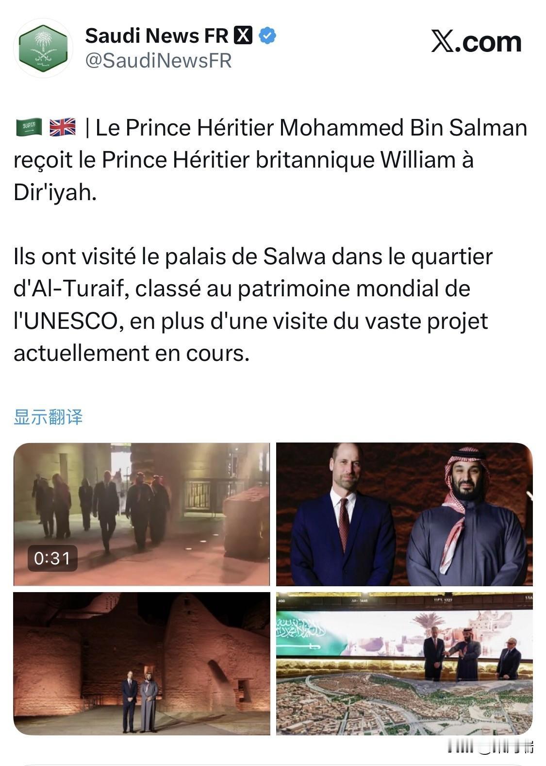 2026年2月9日,沙特王储穆罕默德·本·萨勒曼在利雅得附近的迪里耶接见了首次正式访问沙特阿拉伯的英国王储威廉王子。 王储穆罕默德亲自陪同威廉王子参观了被列为联合国教科文组织世界遗产的图赖夫区。该地区被誉为沙特王室的发祥地和第一沙特王国的首都。 两人在萨尔瓦宫前合影。这座宫殿曾是第一沙特王国的行政中心和权力象征。威廉王子在此了解了该地区的内志(Najdi)建筑风格。 威廉王子听取了关于迪里耶门开发局(Diriyah Gate Development Authority)总体规划的简报。该项目预计投资达630亿美元,旨在将这一历史古镇转型为全球文化和旅游目的地。 威廉王子向沙特王储赠送了一件带有哈里·凯恩亲笔签名的英格兰队球衣。双方随后进行了深入交流,并共进晚餐,旨在庆祝两国即将迎来建交一百周年并加强经贸、能源及投资联系。 威廉王子此次行程为期三天,随后他还将访问埃尔奥拉(AlUla)等文化遗址。