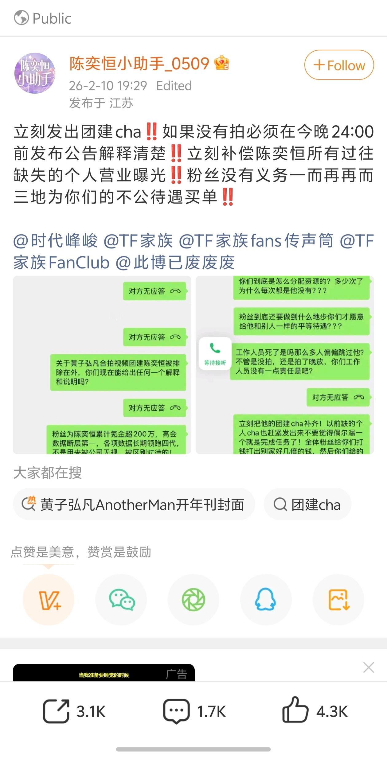 今天多人cha唯独没有陈奕恒,支持粉丝维权👊
