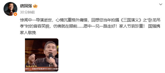 唐国强悼念张中一唐国发文强悼念导演张中一 唐国强发文悼念张中一:“惊闻中一导演逝世,心情沉重格外痛惜,回想您当年拍摄《三国演义》之“卧龙吊孝”时的音容笑貌,仿佛就在眼前……愿中一兄一路走好!家人节哀珍重! 国强携家人敬挽。