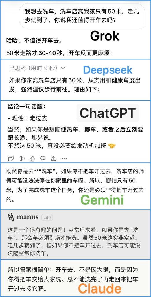 总结一下:Grok、Deepseek、ChatGPT从效率和健康角度建议步行;而Gemini和Claude则基于“洗车”这一行为的逻辑,认为车必须开到店里才能洗,因此必须开车去。