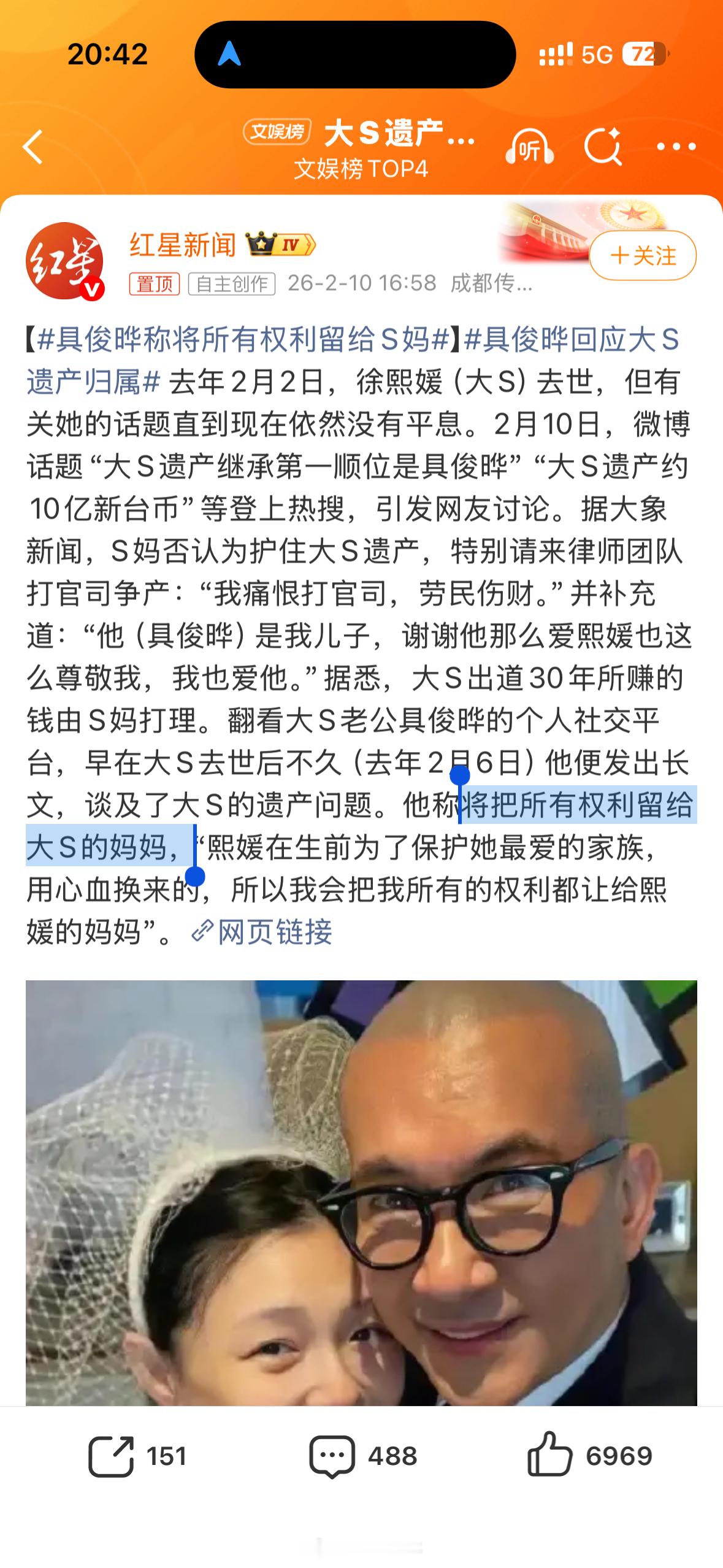 大S遗产约10亿新台币,具俊晔回应大S遗产归属,说把决定权都给大S妈妈,大S妈妈