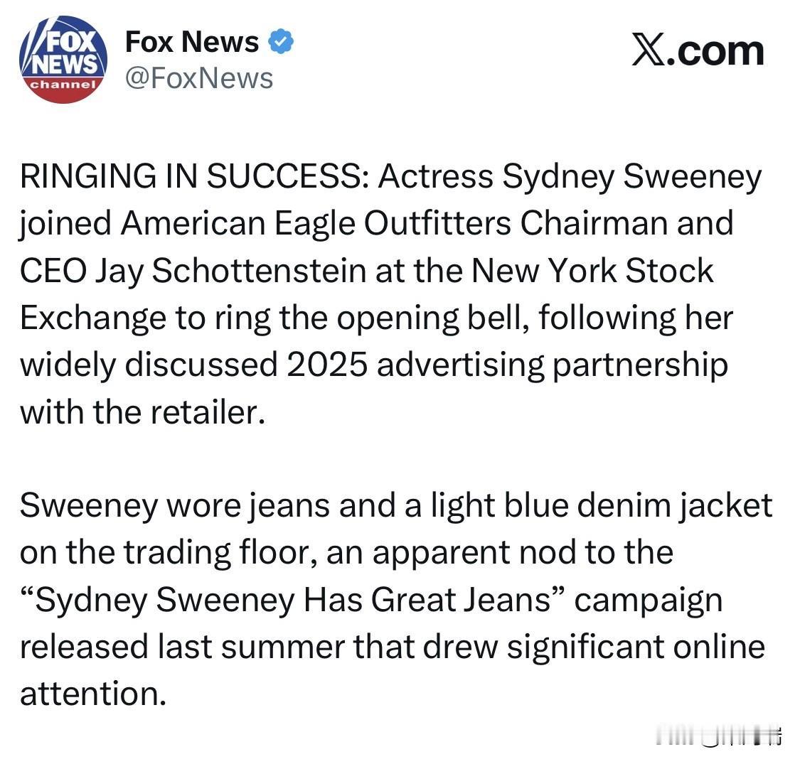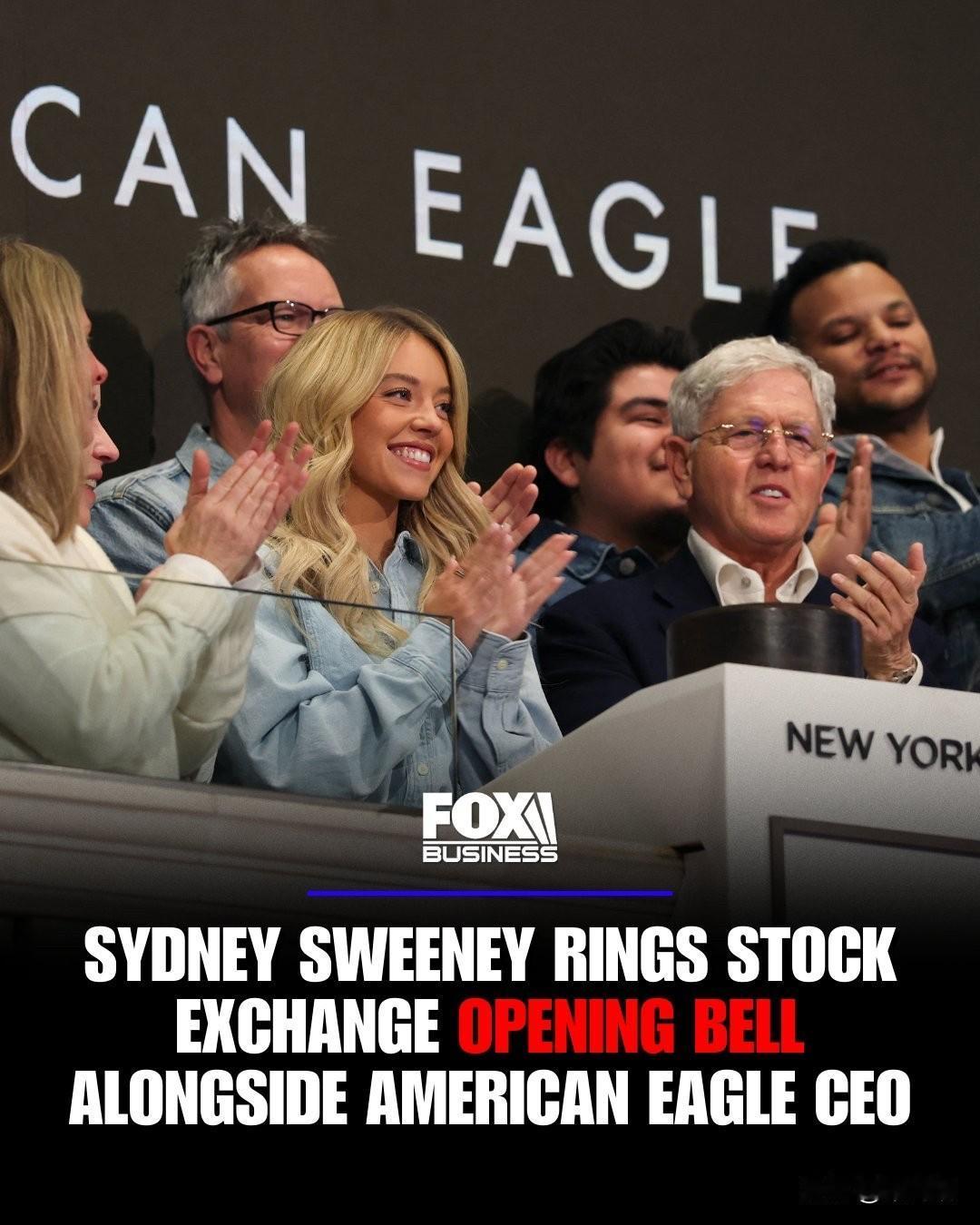2026 年 2 月 9 日。女演员悉尼·斯威尼 (Sydney Sweeney) 与美国鹰牌服饰 (American Eagle Outfitters, AEO) 董事长兼首席执行官杰伊·肖滕斯坦 (Jay Schottenstein) 共同在纽约证券交易所 (NYSE) 敲响了开市钟。 斯威尼此行是为了庆祝她与该零售商延续至 2026 年的深度合作。此前,双方在 2025 年夏季推出了备受瞩目的 “悉尼·斯威尼拥有很棒的牛仔裤” (Sydney Sweeney Has Great Jeans) 广告活动。 着装寓意:斯威尼在交易大厅穿着全套牛仔装(包括牛仔裤和浅蓝色牛仔夹克),这不仅是对其病毒式传播广告的致敬,也展示了该品牌的主打产品。 市场影响: 肖滕斯坦表示,与斯威尼的合作造就了公司历史上最难忘的营销活动之一,并直接推动了 2025 年下半年的业务增长。 在广告发布后的几个月里,美国鹰牌服饰的股价显著上涨,曾一度在六个月内上涨了 136%。 该广告曾因“Jeans/Genes”(牛仔裤/基因)的双关语引发网络讨论。公司通过 官方声明 强调,该活动“始终是关于牛仔裤的”,旨在展示产品的自信与包容性。 作为协议的一部分,双方推出了限量版 “Sydney Jean”,其收益全部捐赠给斯威尼支持的心理健康非营利组织 Crisis Text Line。