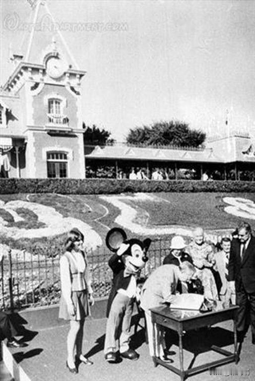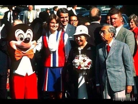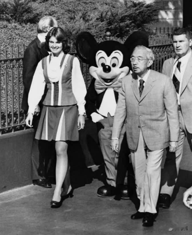 这张照片记录了日本昭和天皇(裕仁)于1975年10月8日访问美国加州迪士尼乐园的历史瞬间。 1975年,昭和天皇与香淳皇后对美国进行了为期两周的正式访问,这是日本天皇首次正式访美。在访问期间,天皇夫妇由当时的迪士尼乐园大使陪同游览。照片中,天皇身着西装,正走在身穿标志性燕尾服的米老鼠身旁。 这次访问留下了一个著名的轶事。天皇在游览期间获赠了一块米老鼠手表。据报道,天皇非常珍视这块手表,即便在正式场合也会佩戴,并将其视为最心爱的物品之一。1989年昭和天皇去世时,这块米老鼠手表与其生前使用的显微镜(他是一位热衷于海洋生物学的研究者)一起作为随葬品,被安葬在武藏野陵。
