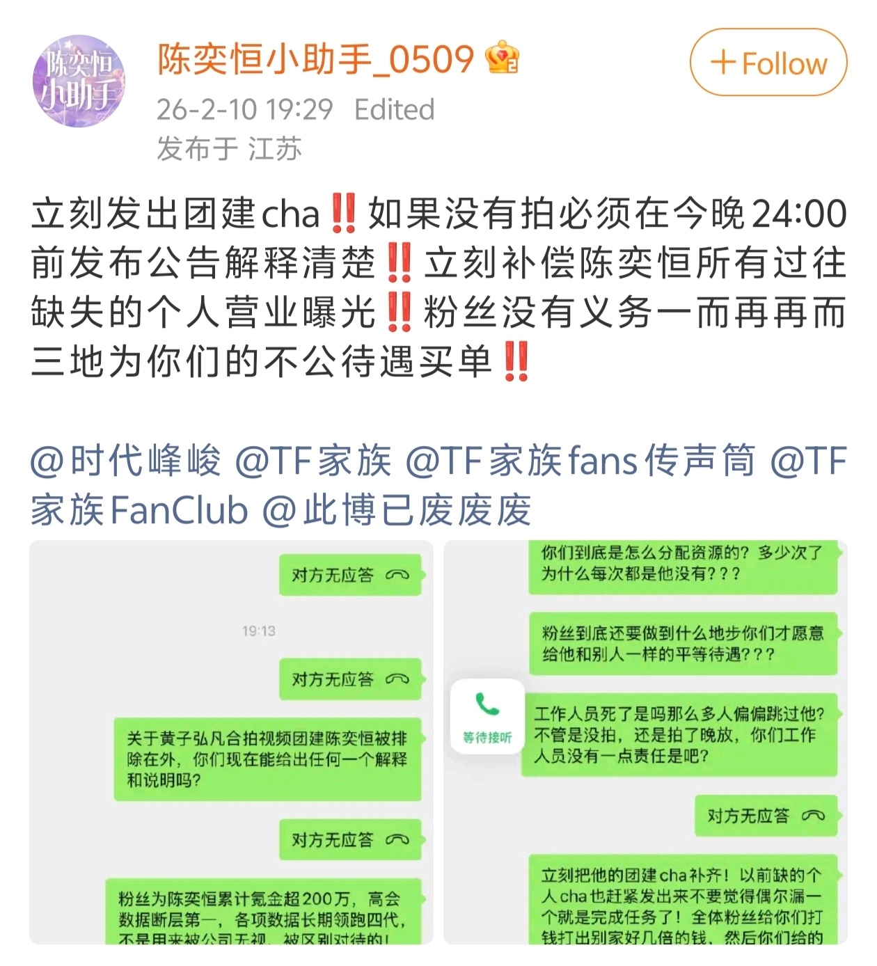 今天多人cha唯独没有陈奕恒,支持粉丝维权👊