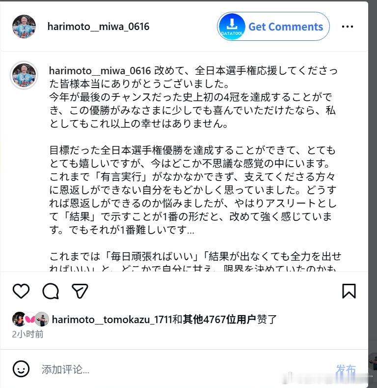 张本智和张本美和其它 260210 张本智和点赞了妹妹的ins新小作文。美和晒了全日锦四冠王赞助商送的花和小礼物,发长文表示感谢,并表达了在乒乓道路上继续拼博、争取用结果回报支持者的决心。