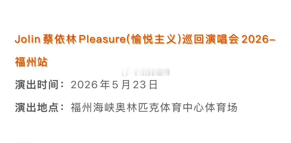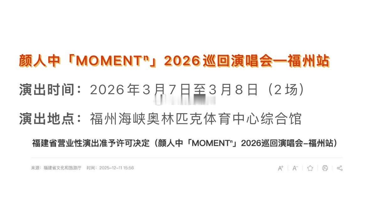 2026年多场演唱会将在福州举办 颜人中演唱会福州站 3.7-3.8 2026Ella陈嘉桦福州站 4.4-4.5 Jolin蔡依林Pleasure福州站 5.23 via最爱福州 虎纠人讲福州