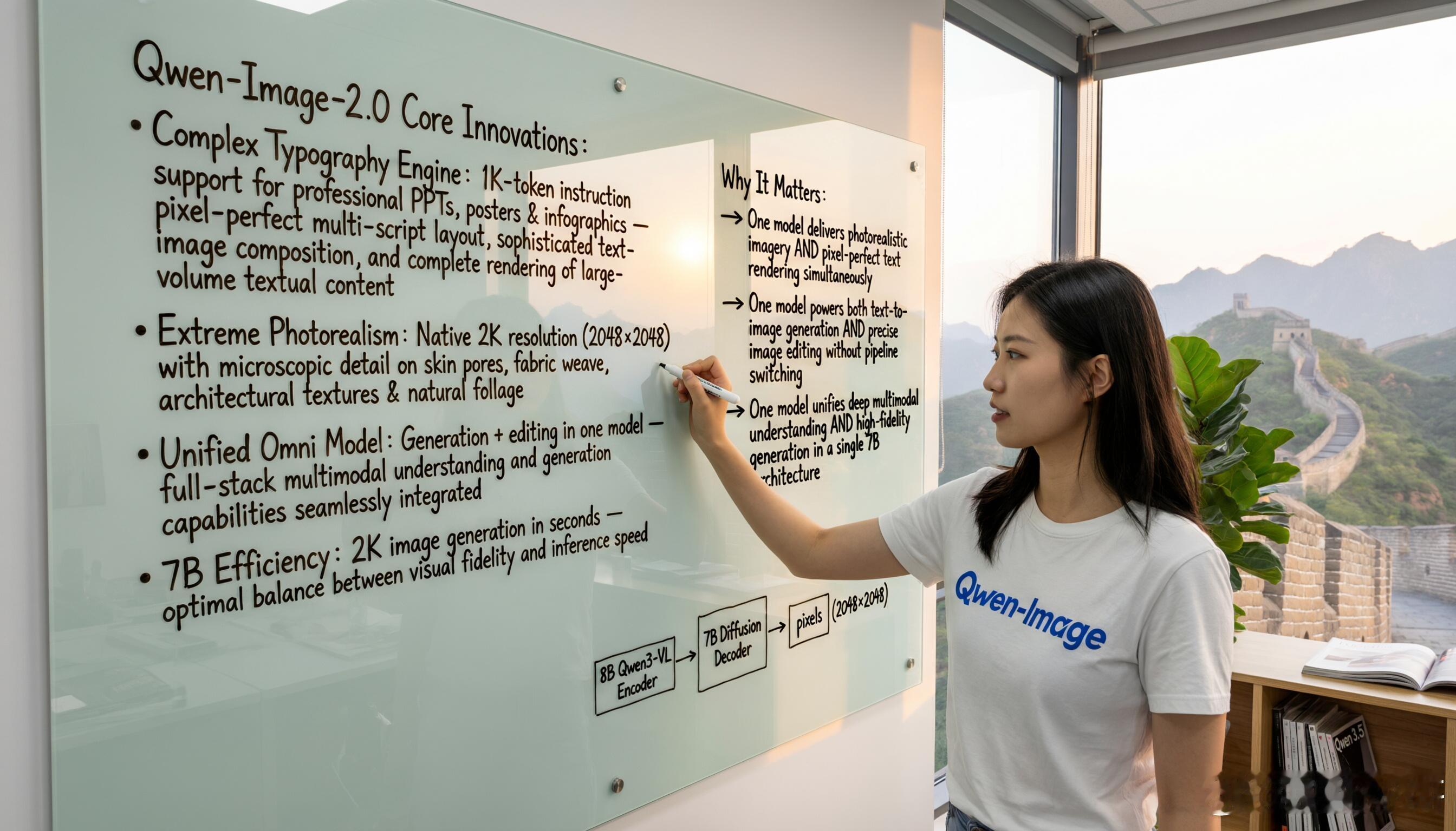 千问发布QwenImage2.0千问全新升级,QwenImage2.0重磅登场,以技术突破重塑AI图像创作体验。模型首创生图与编辑一体化架构,无需切换即可完成从创作到精修,流程更高效。支持1K token超长指令与2K高清分辨率,精准理解复杂需求,直出海报、PPT、信息图等专业作品。