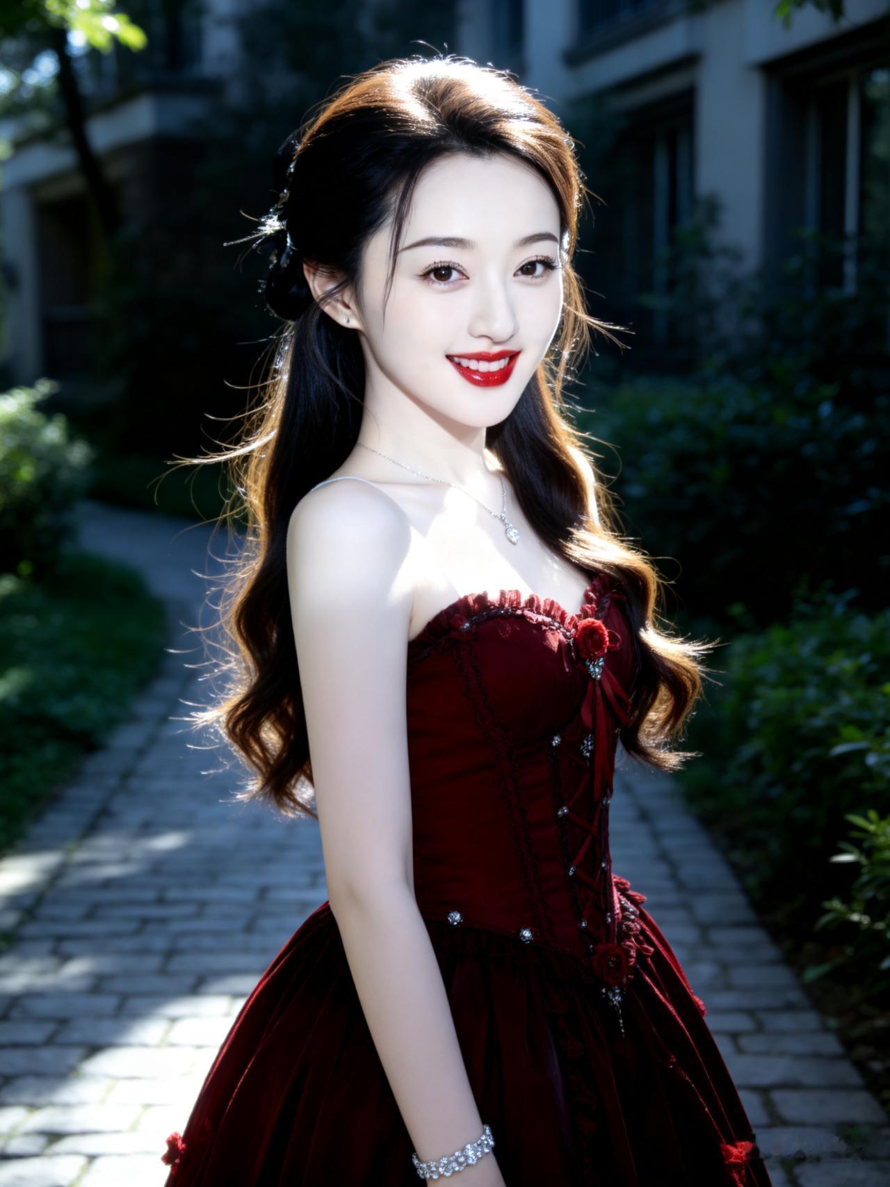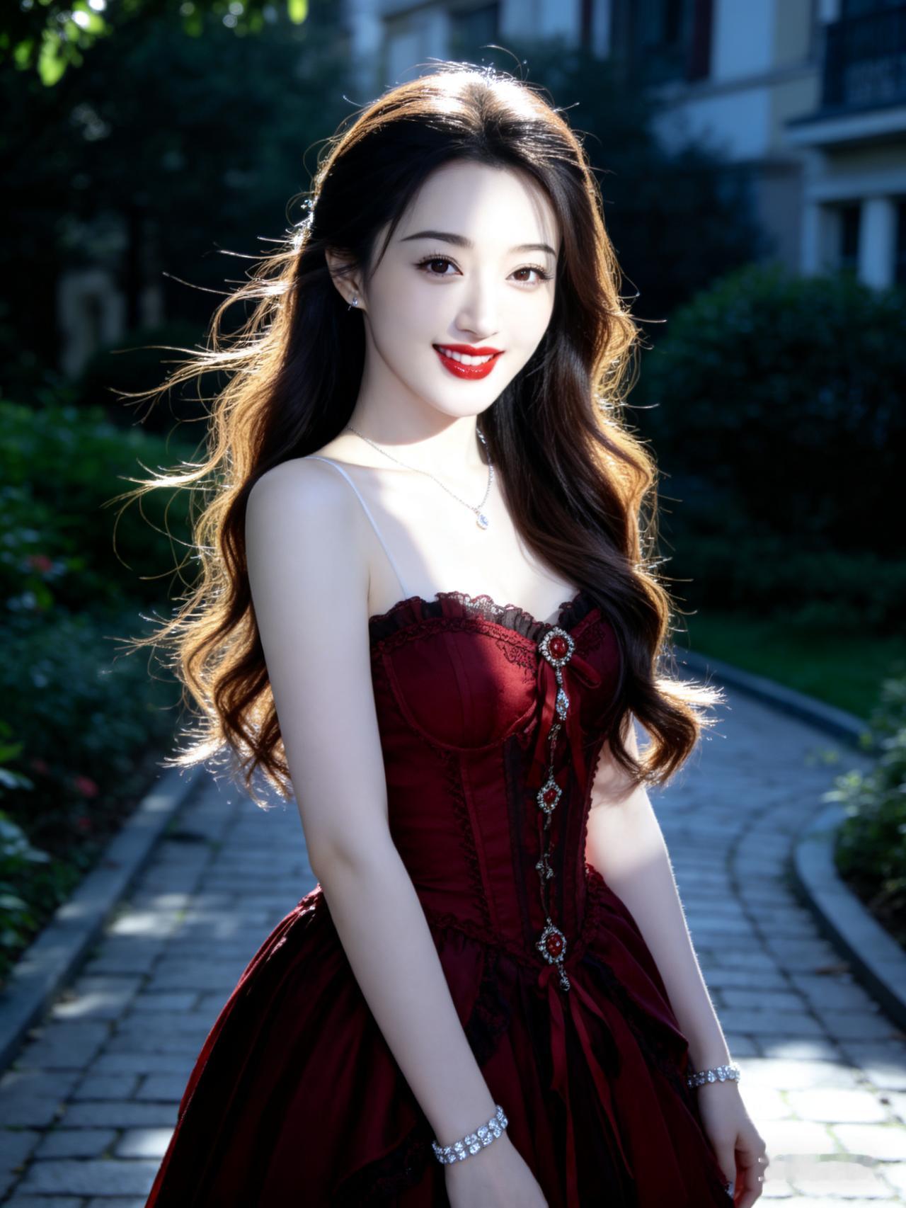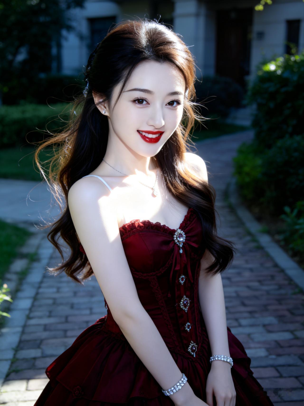 优雅红裙,阳光下的甜美少女