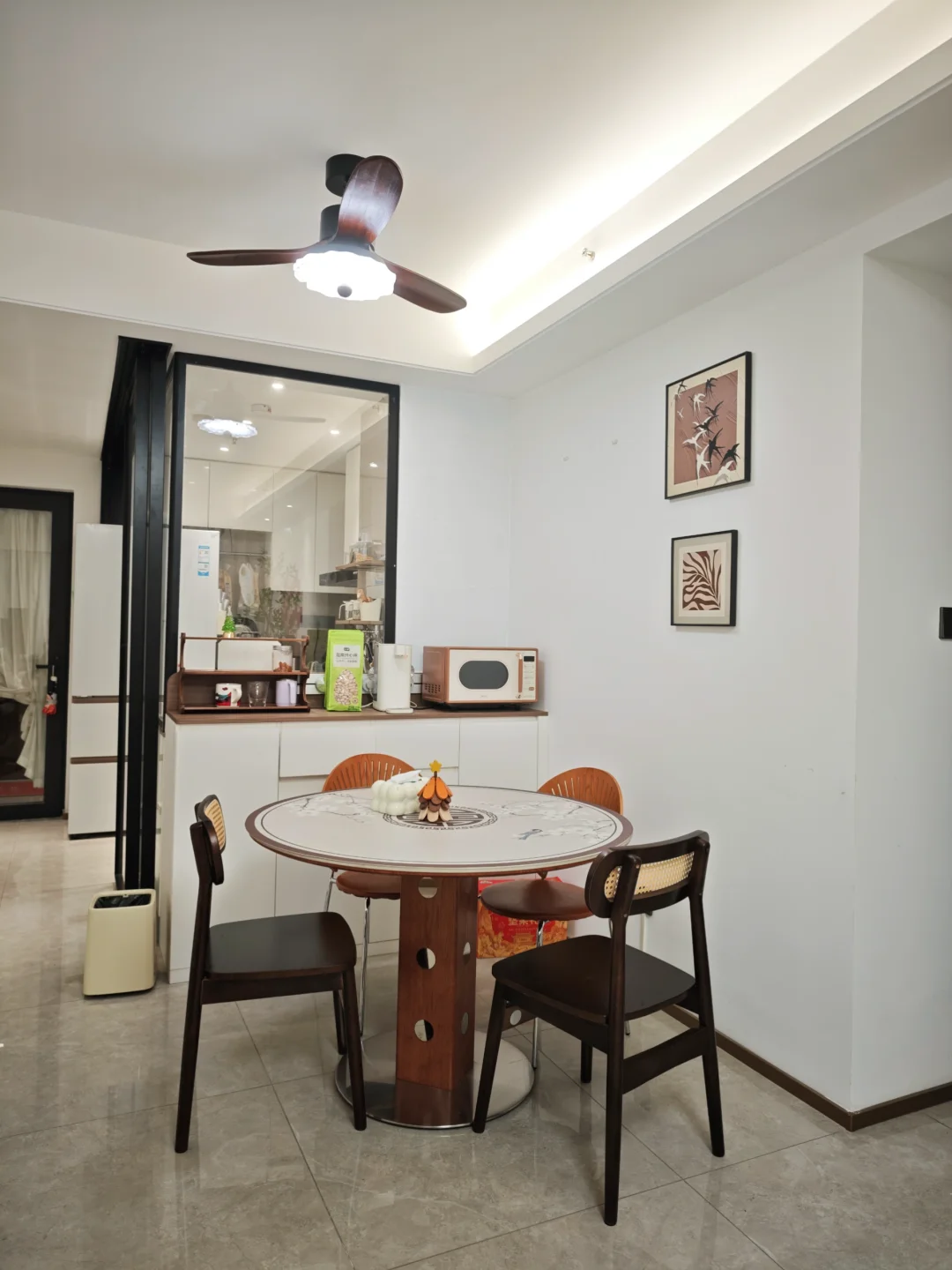 第二版装修实景效果图来了第一版是明亮的奶油风第二版是加入了深色和岩板点缀的简约轻