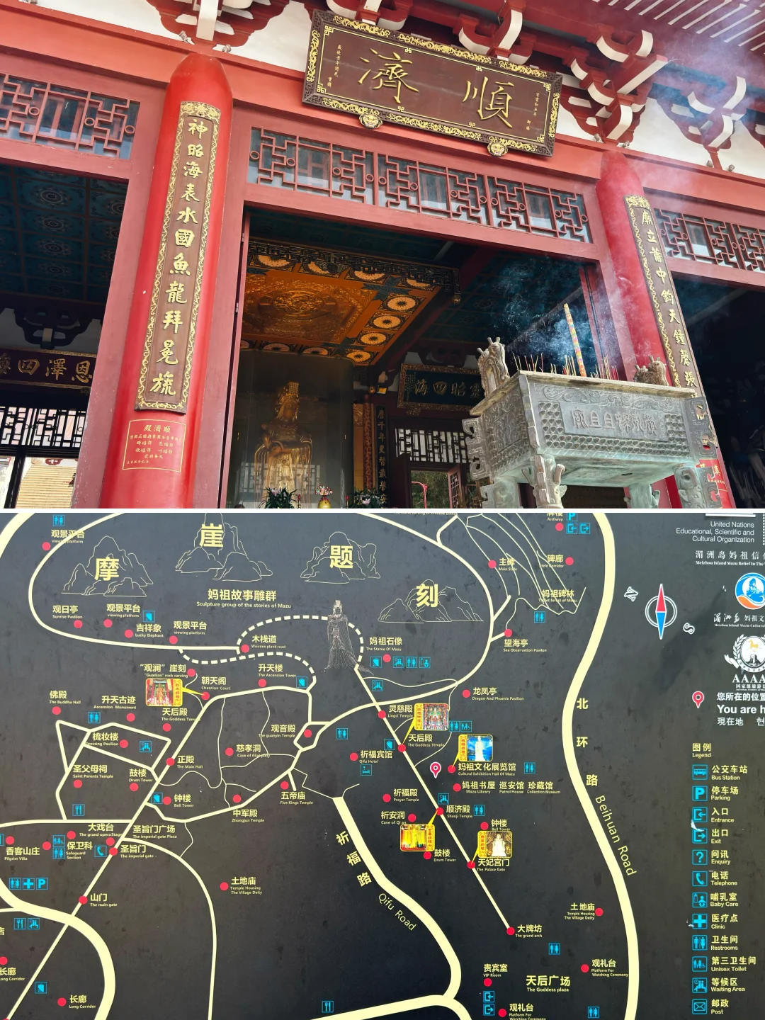 福建湄洲岛妈祖庙‘顺济殿’妈祖像。 [向右R]湄洲岛顺济殿2001年由惠安许氏四兄弟捐建。殿内供奉全球最大最重的黄金妈祖像(高3.23米,重323公斤,价值1.6亿元),为妈祖庙镇庙之宝。 [清单R]参考2001年黄金价格每克72至85元。