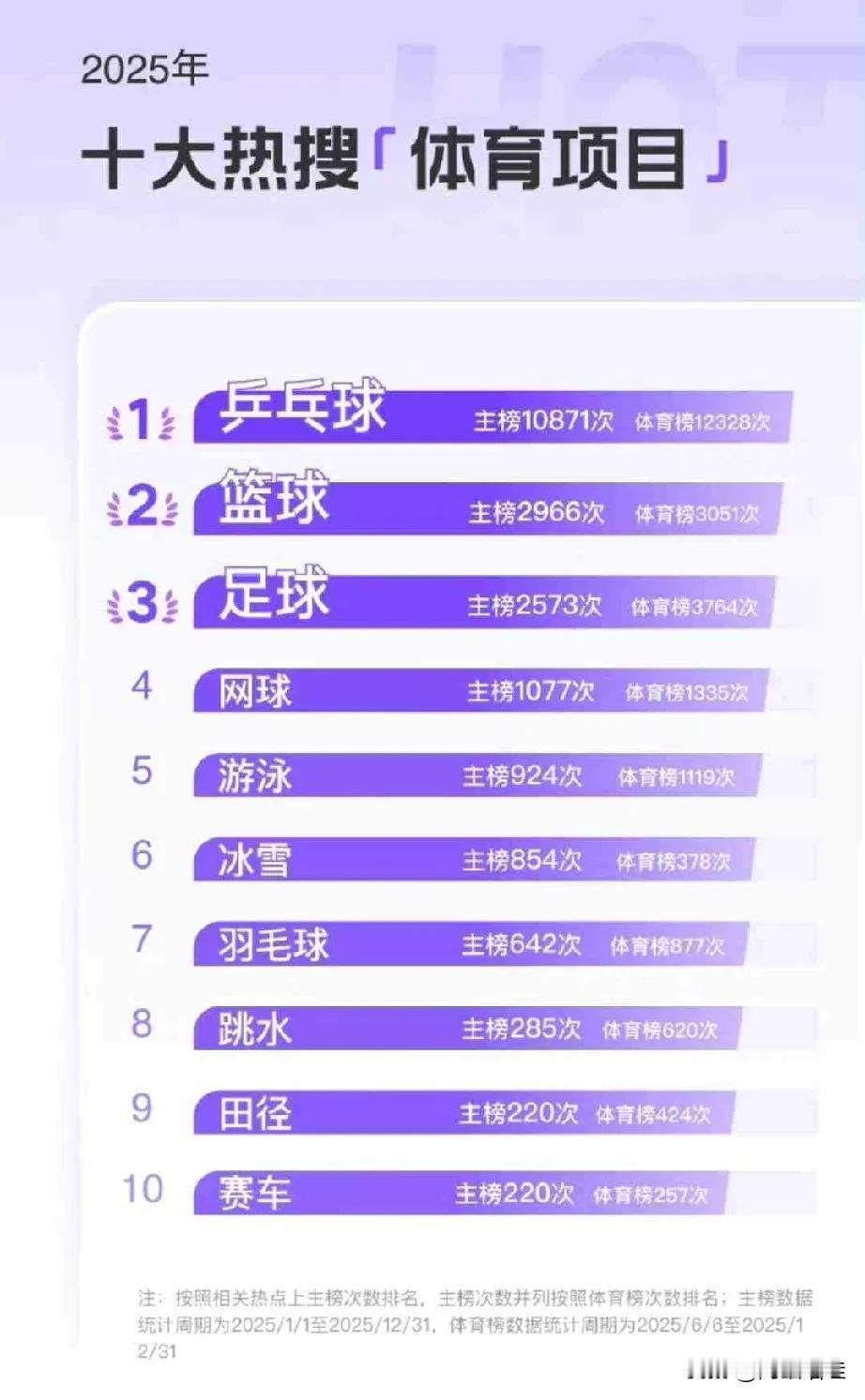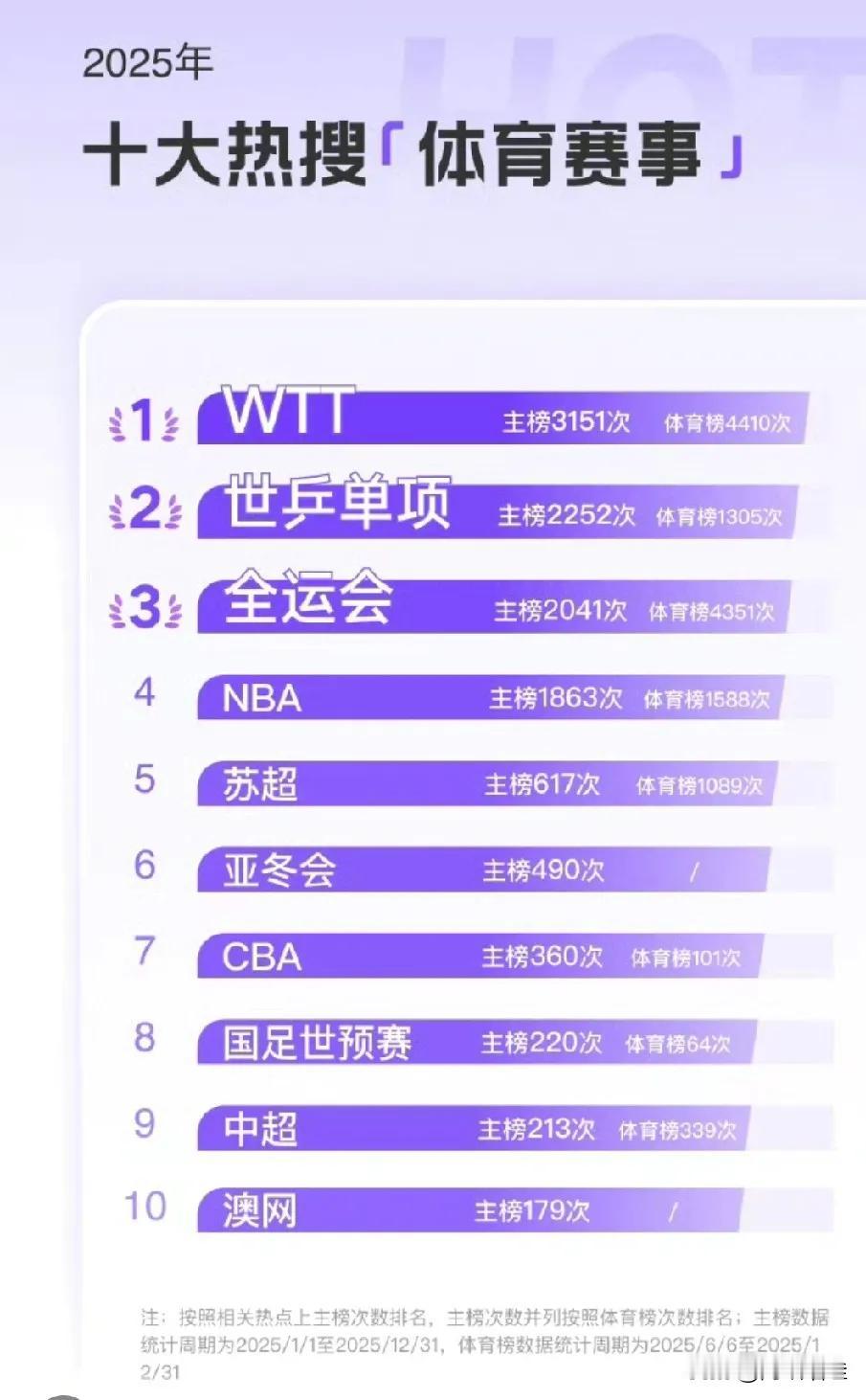 2025年十大热搜榜体育赛事 排名第一的乒乓球项目中的WTT,第二多哈世乒赛单打 第三是全运会,[赞][赞][赞] 乒乓球项目占据前三[赞][赞] 十大热搜运动员,乒乓球运动员占8分,另一位是郑钦文,全红婵。 第一名孙颖莎2653次 第二名王楚钦2594次 第三名樊振东1402次 第四名王曼昱720次 莎莎世界排名第一,王曼昱排名第二,但是人气流量两个人相差太多了,人气流量决定一个赛事的举办挣不挣钱。 有孙颖莎,王楚钦的参赛举办方挣钱,没他们参赛举办方赔钱,樊振东的人气流量也不错 德甲有他参赛也挣钱。 这就是明星球员的商业价值,不服没用。[呲牙][呲牙][呲牙][呲牙]