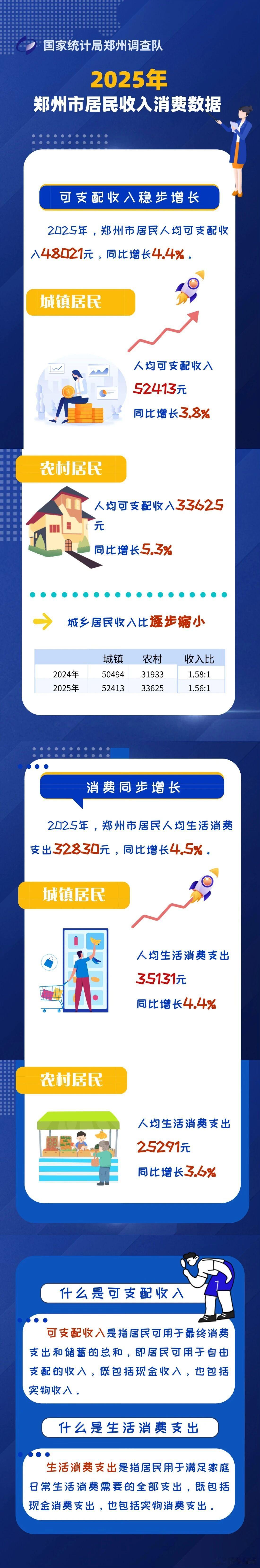 【先睹为快!2025年郑州市居民收入消费数据】2月10日,国家统计局郑州调查队公布了2025年郑州市居民收入消费数据。可支配收入稳步增长——2025年,郑州市居民人均可支配收入48021元,同比增长4.4%。其中,城镇居民人均可支配收入52413元,同比增长3.8%;农村居民人均可支配收入33625元,同比增长5.3%。消费同步增长——2025年,郑州市居民人均生活消费支出32830元,同比增长4.5%。其中,城镇居民人均生活消费支出35131元,同比增长4.4%;农村居民人均生活消费支出25291元,同比增长3.6%。(郑州调查)