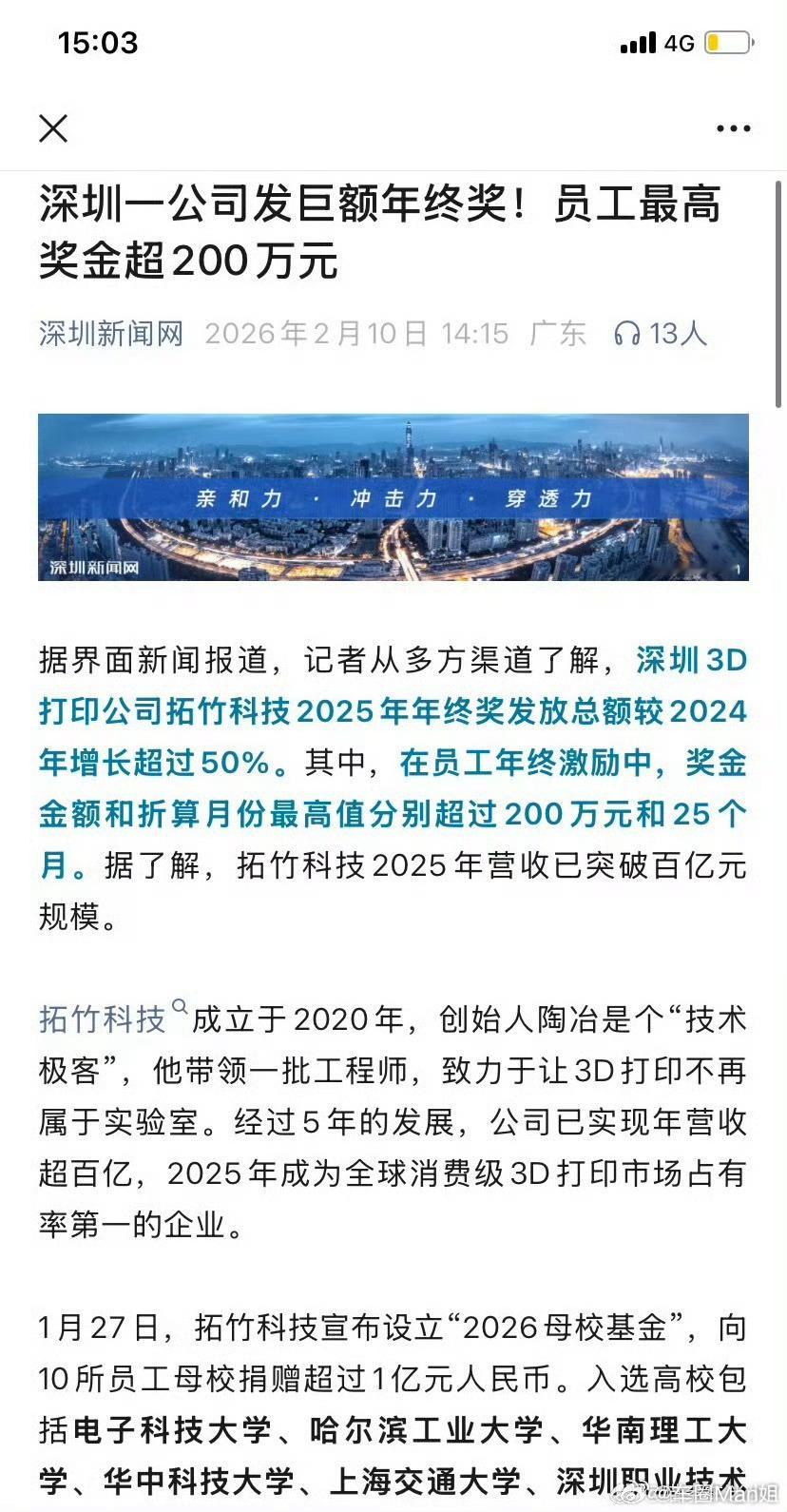深圳拓竹科技刷屏:成立5年营收破百亿,全球消费级3D打印市占第一;年终奖最高超200万、达25个月,总额同比增超50%,还捐1亿设员工母校基金。