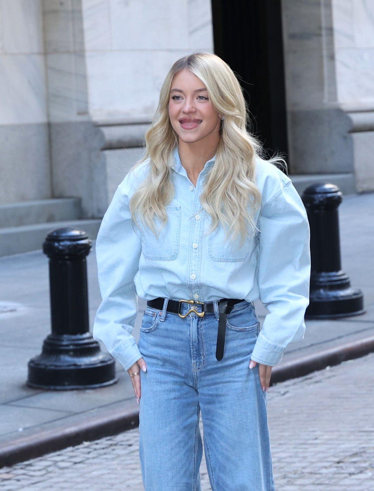 悉尼妹Sydney Sweeney 不露胸,这样穿衬衫、牛仔裤不也挺好看的嘛!时尚灵感解读