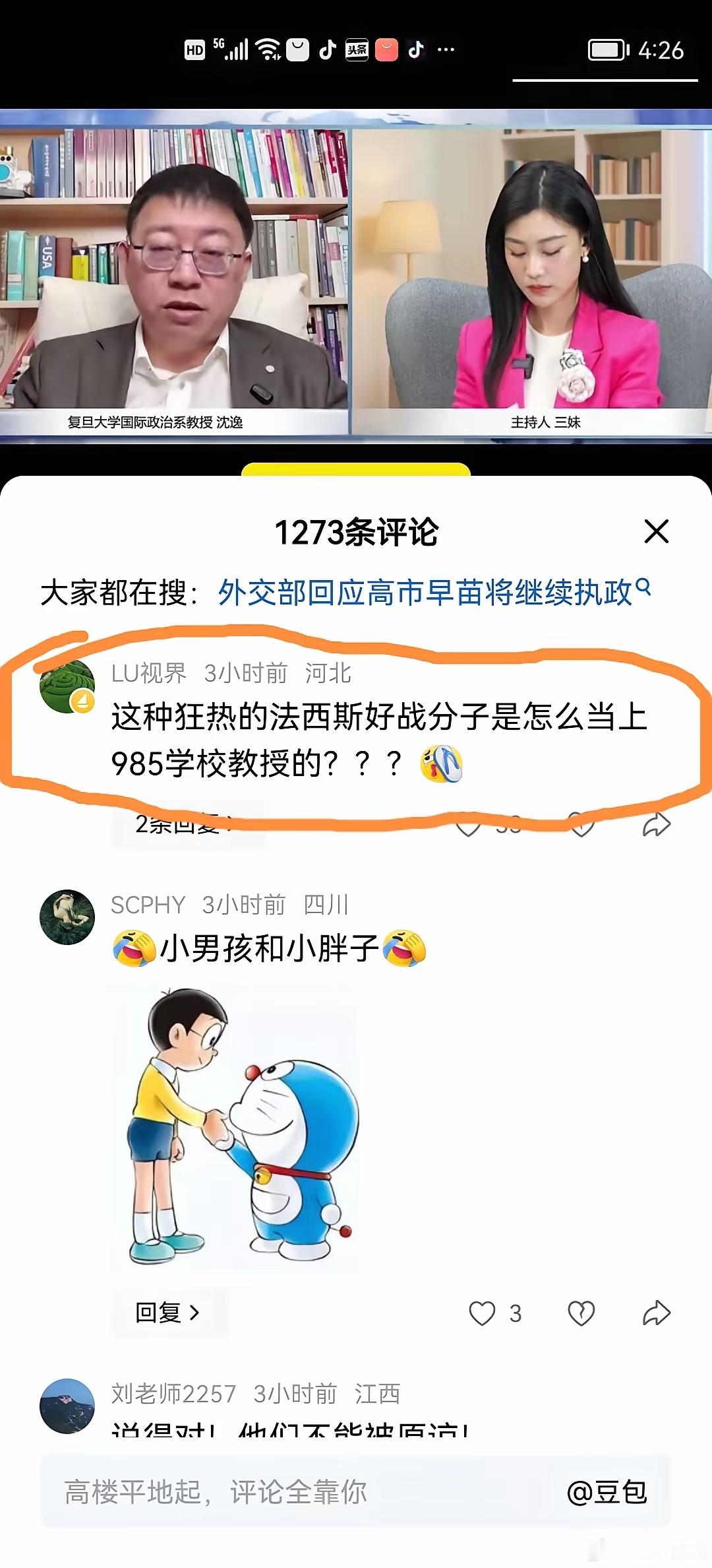 沈逸教授针对高市早苗的胜选,说如果日本走上军国主义道路,日本国民理应承担后果,像二战战败后被清算一样。很多网友认同沈逸教授,都认为“雪崩之后,没有一片雪花是无辜的”。但恐怖的是,沈教授遭到了大量的攻击,攻击他的人到底是理中客还是精日分子?日本就没有真正反省过给亚洲国家带来的戕害,军国主义一直蠢蠢欲动,真到了开战的那天,我相信大多数国人都会像张雪峰老师说台海问题那样,愿出自己的一份力。