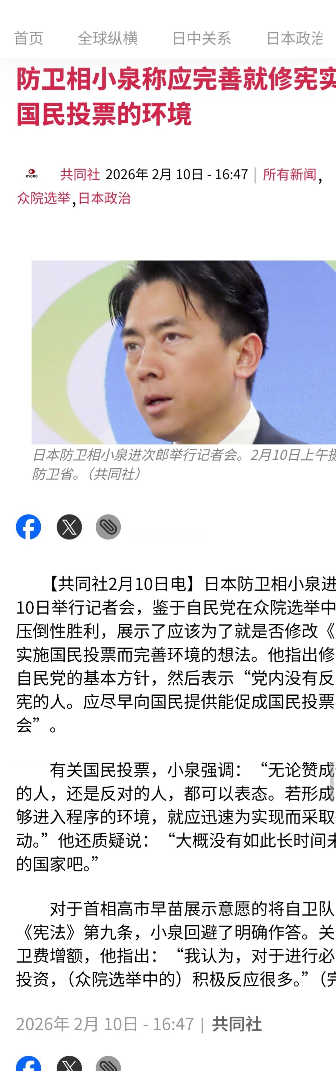 对于首相高市早苗展示意愿的将自卫队写入《宪法》第九条,小泉回避了明确作答。关于防卫费增额,他指出:“我认为,对于进行必要的投资,(众院选举中的)积极反应很多”。海外新鲜事