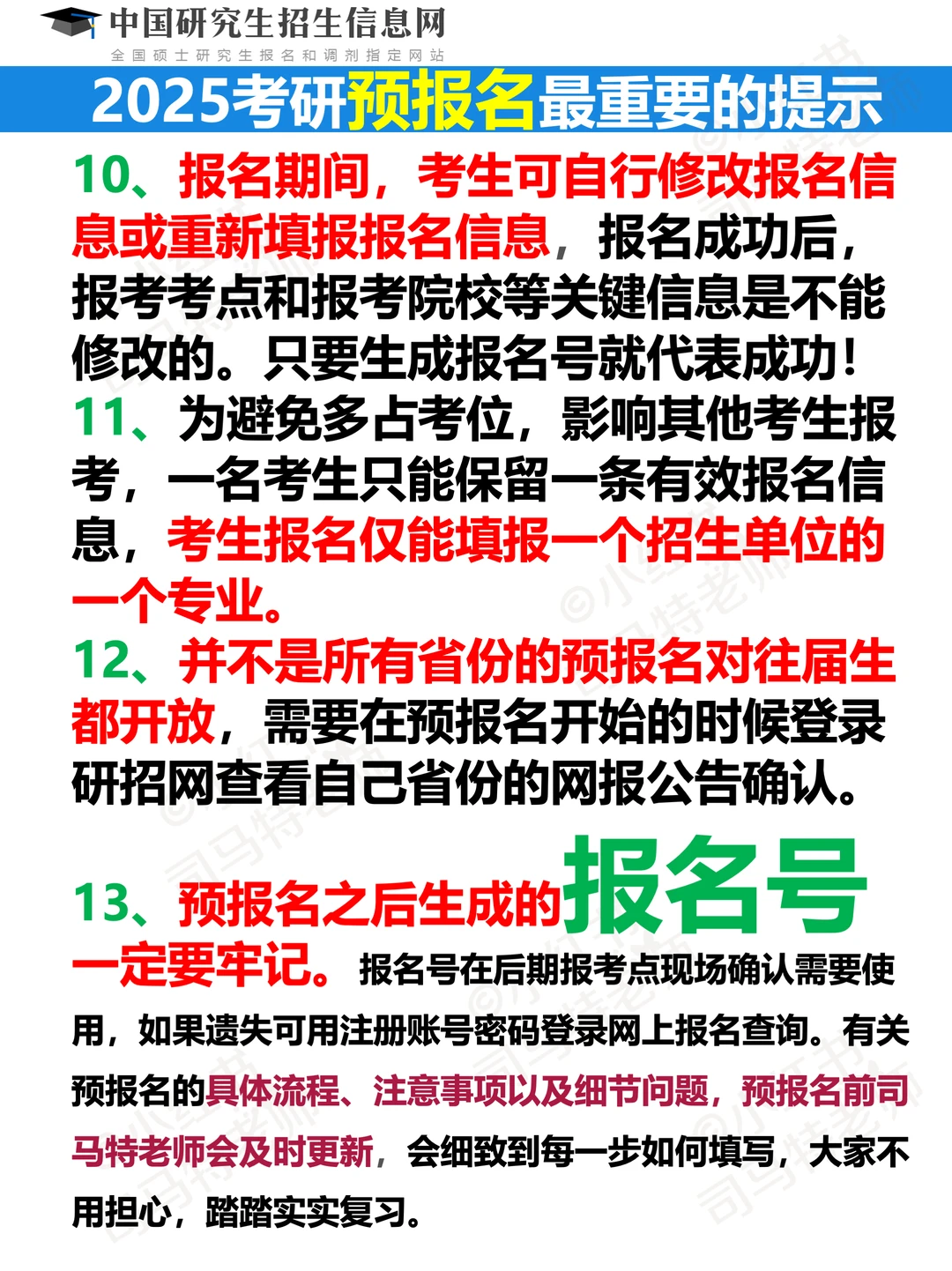 11、为避免多占考位,影响其他考生报考,一名考生只能保留一条有效报名信息,考生报名仅能填报一个招生单位的一个专业。12、并不是所有省份的预报名对往届生都开放,需要在预报名开始的时候登录研招网查看自己省份的网报公告确认。