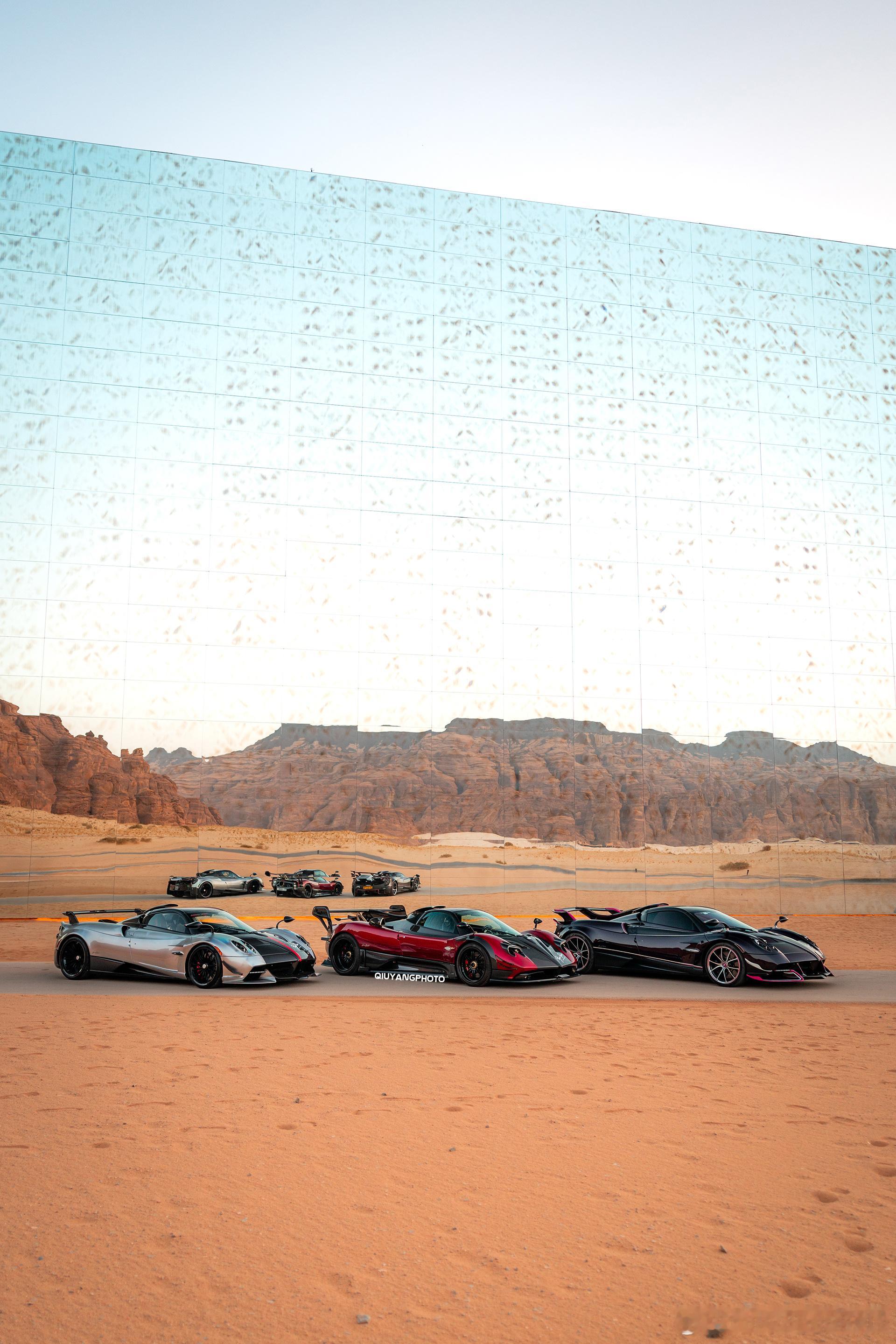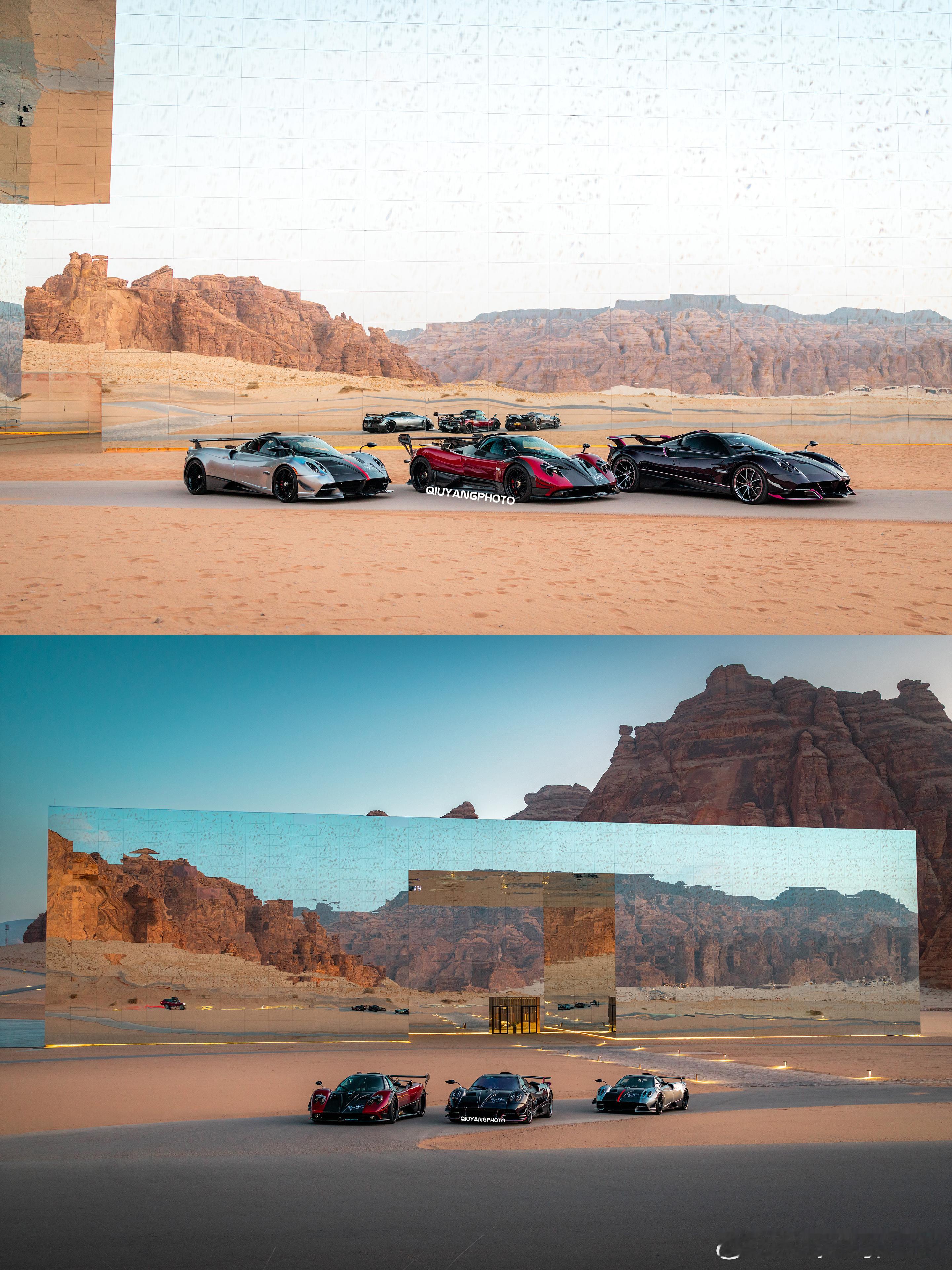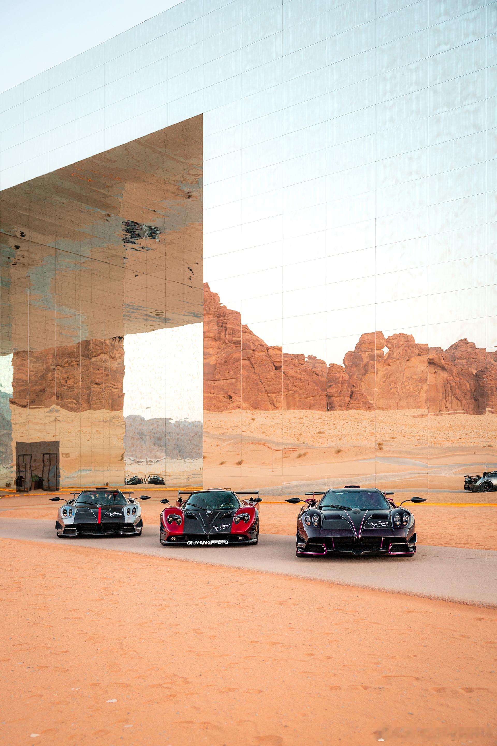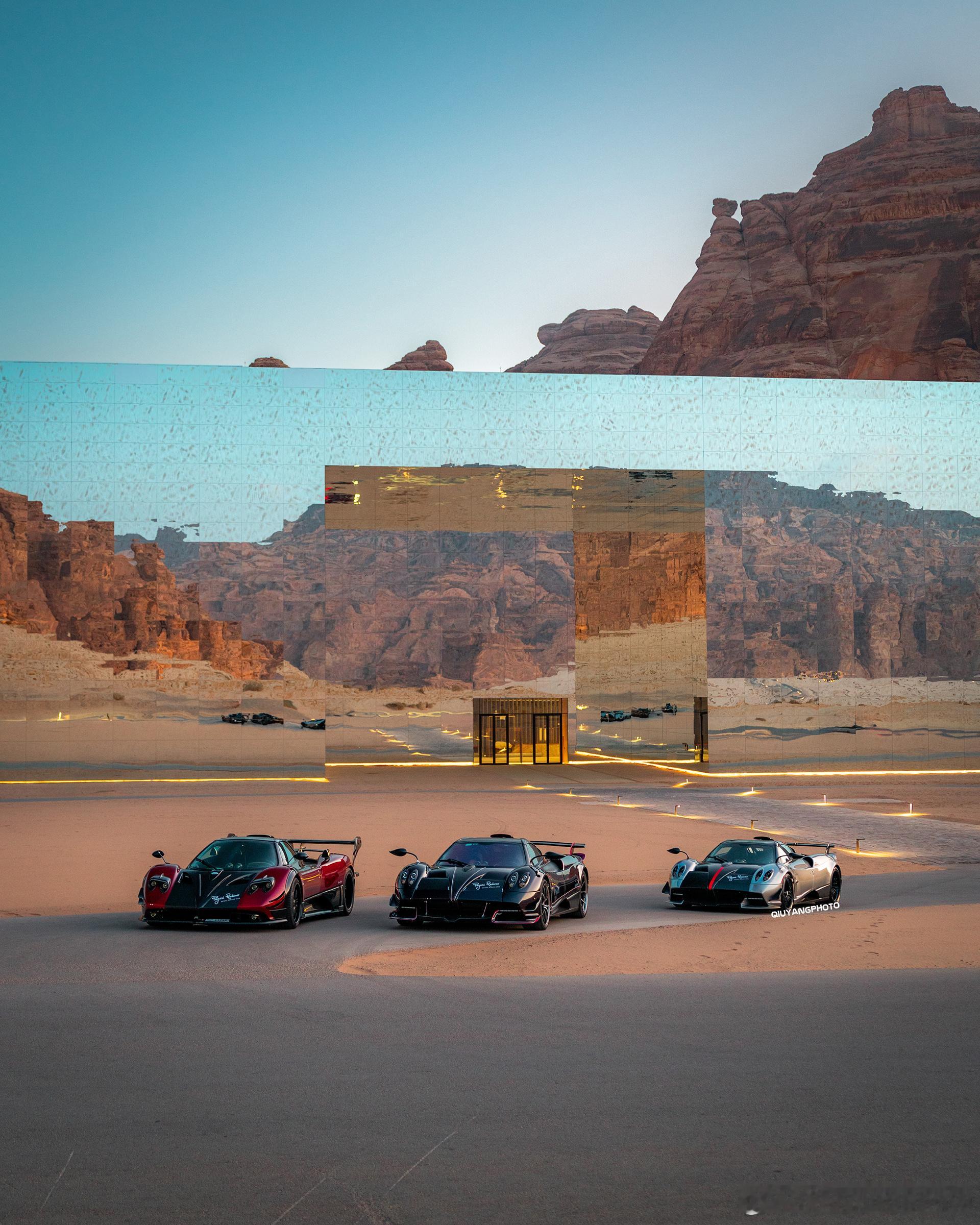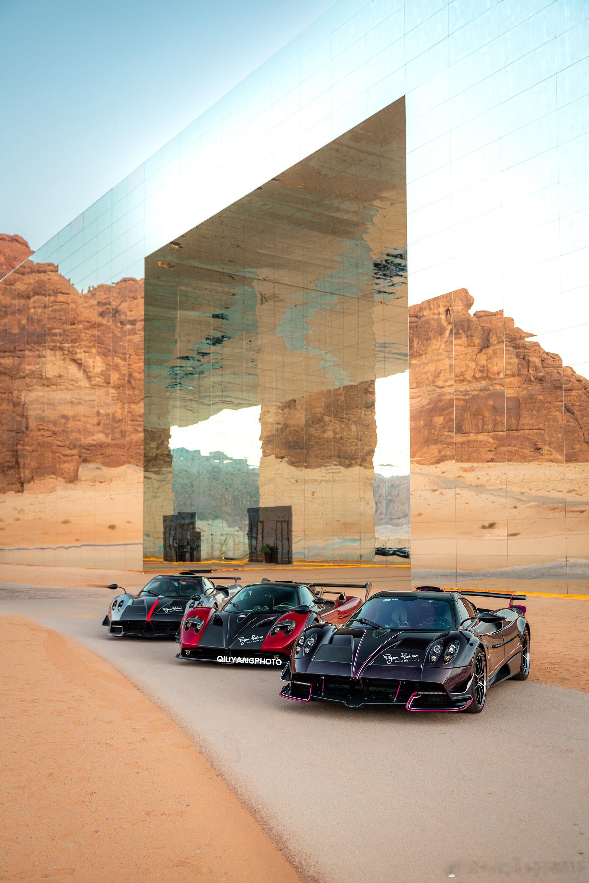 Pagani Raduno Desert Mirage 2026 cars01豪车拍全民拍车 傍晚时分 没什么游客的Maraya 沙漠中的镜面音乐厅与三台美丽的帕加尼