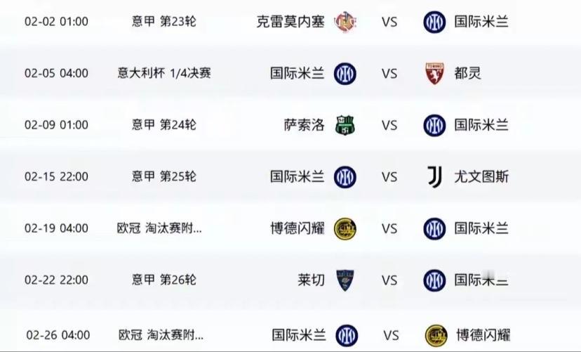 养精蓄锐!国际米兰已持续了一个多月的一周双赛,球员们身心俱疲,但主教练齐沃轮换到位且合理,球队战绩出色,联赛稳居第一,而欧冠也顺利进入淘汰赛附加赛。 本周难得的周中没有比赛,期待国际米兰的将士们能好好调整,养精蓄锐,毕竟周末迎战死敌尤文图斯,而且马上又要开始连续的一周双赛了。 加油,期待球队在下一个魔鬼赛程周期依然能取得好成绩。
