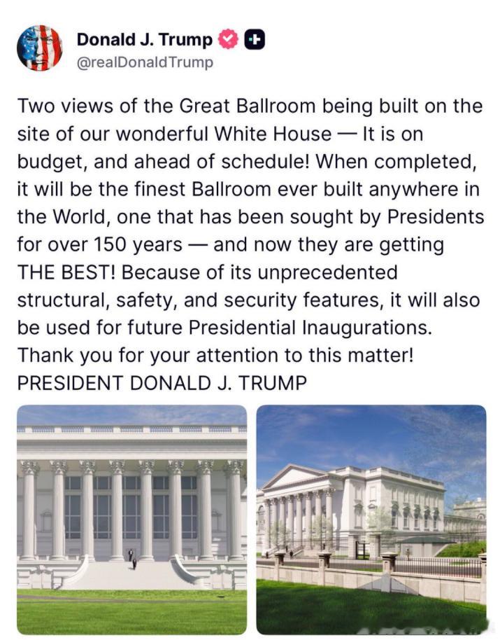 “两张正在我们宏伟的白宫工地上建造的大宴会厅的照片——它不仅预算控制在范围内,而且提前完工!建成后,它将成为世界上建造过的最精美的宴会厅,也是历任总统150多年来梦寐以求的——现在,他们终于如愿以偿!由于其前所未有的结构、安全和安保措施,它还将用于未来的总统就职典礼。感谢大家对此事的关注!唐纳德·J·特朗普总统”