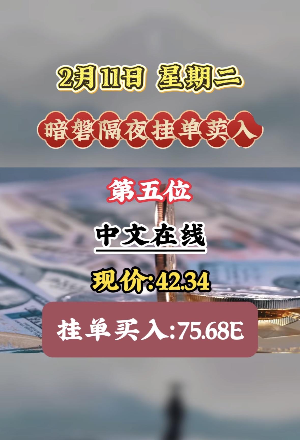 2月11日暗盘隔夜挂单买入,中文在线现价42.34,挂单买入75.68E "暗盘布局抢先机,巨力索具引关注,低位吸筹正当时,静待市场风云起。"