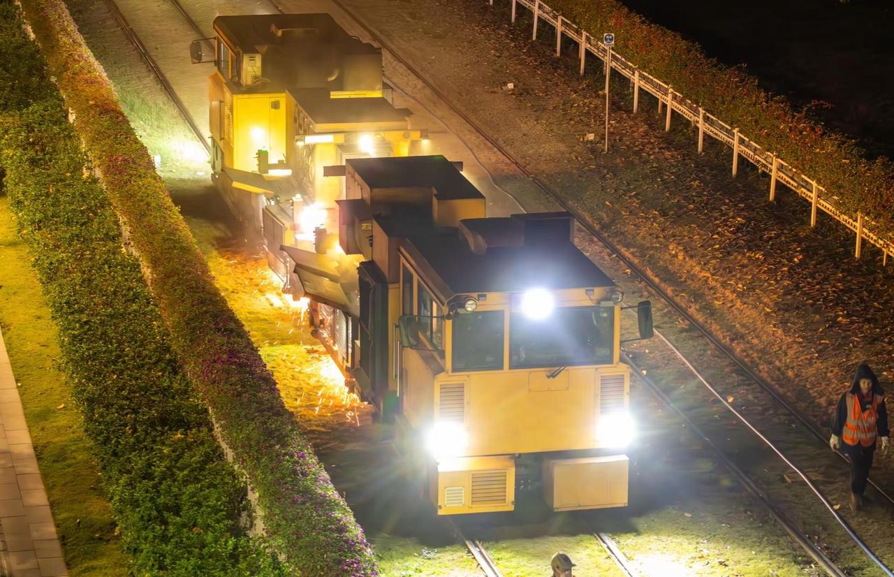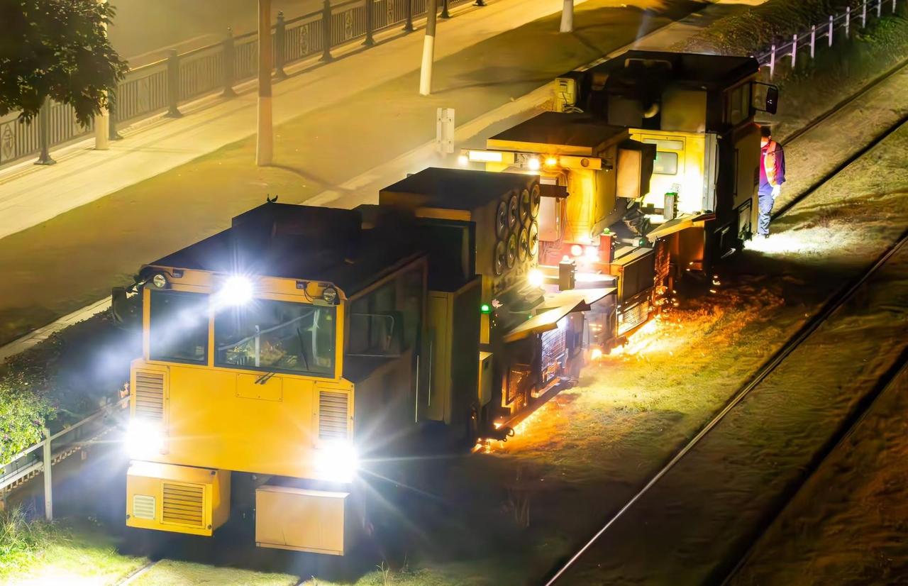 深夜·海珠有轨电车1号线钢轨打磨。有轨电车 广州地铁 内燃机车 火车