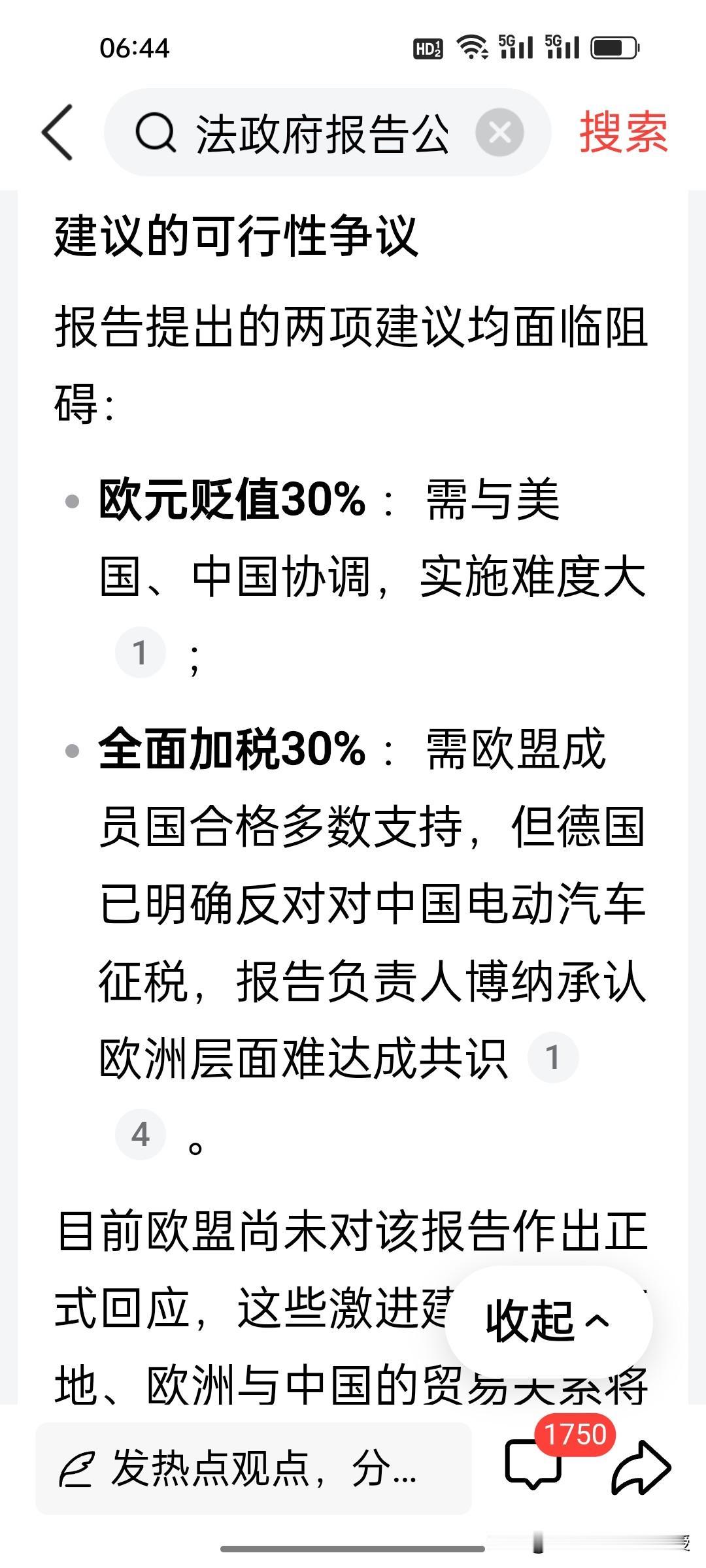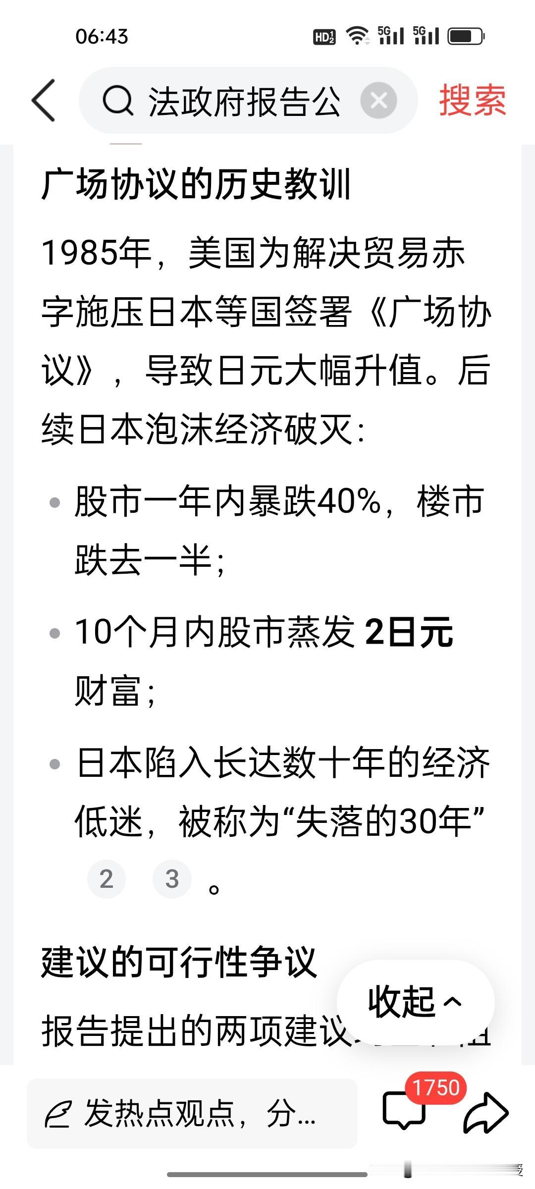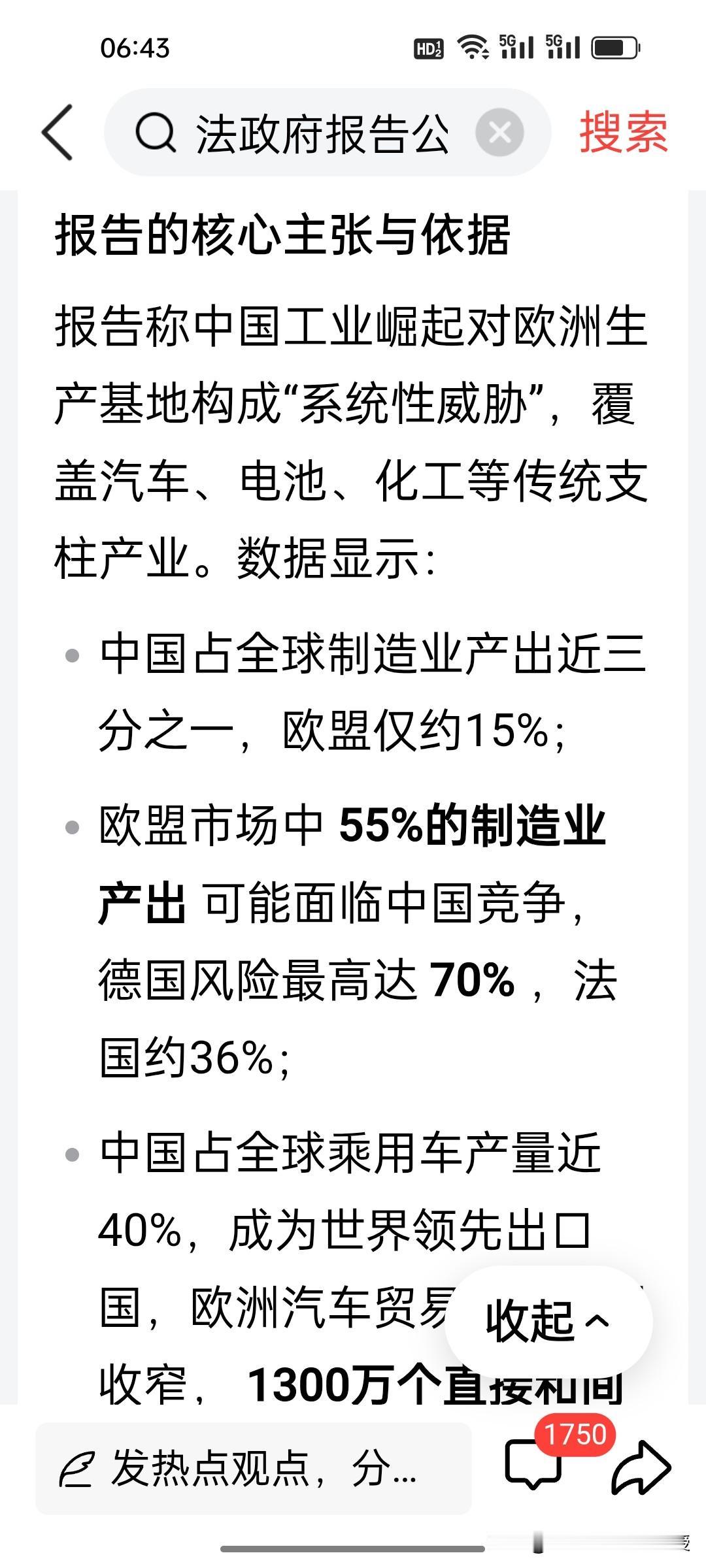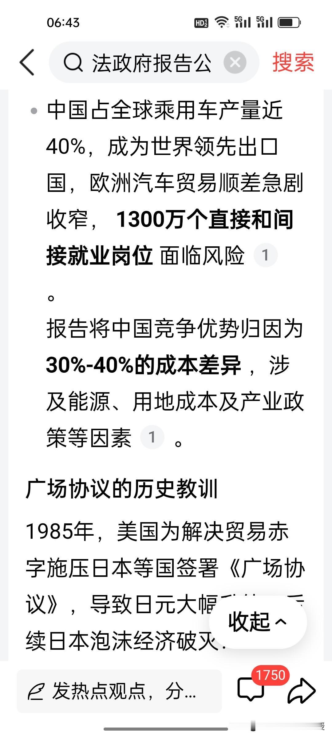 法国这是急疯了?竟要对中国搞“新广场协议”? 法国政府咨询机构“高等战略与规划委员会”2月9日的报告,简直就是“黔驴技穷”。 报告里说,中国占全球制造业产出近1/3,欧盟仅15%;欧盟55%的制造业产出面临中国竞争,德国风险高达70%。于是他们抛出两个疯狂方案:对中国商品全面加税30%,或让欧元对人民币贬值30%,还公然对标1985年的《广场协议》。 这两个建议的危害,最先影响的不是中国,而是欧洲本身: 1. 全面加税30%:会直接推高欧盟消费者的生活成本,通胀压力加剧,同时引发中国对等反制,欧盟对华出口的航空、汽车、农产品等将首当其冲,1300万相关就业岗位风险陡增。法国大罢工恐怕要天天上演。 2. 欧元贬值30%:会重蹈日本“失落30年”的覆辙,资本外逃、资产泡沫破裂,欧元国际信用崩塌,欧盟一体化进程也将被撕裂。 这两个方案,一个要欧盟成员国一致同意,德国已明确反对;一个要中美协调,实施难度堪比登天。 反观现在,能在访华前后始终如一的国家,也就英国和加拿大了。法国这波操作,除了暴露自己的焦虑,也只剩下“狐假虎威”了。