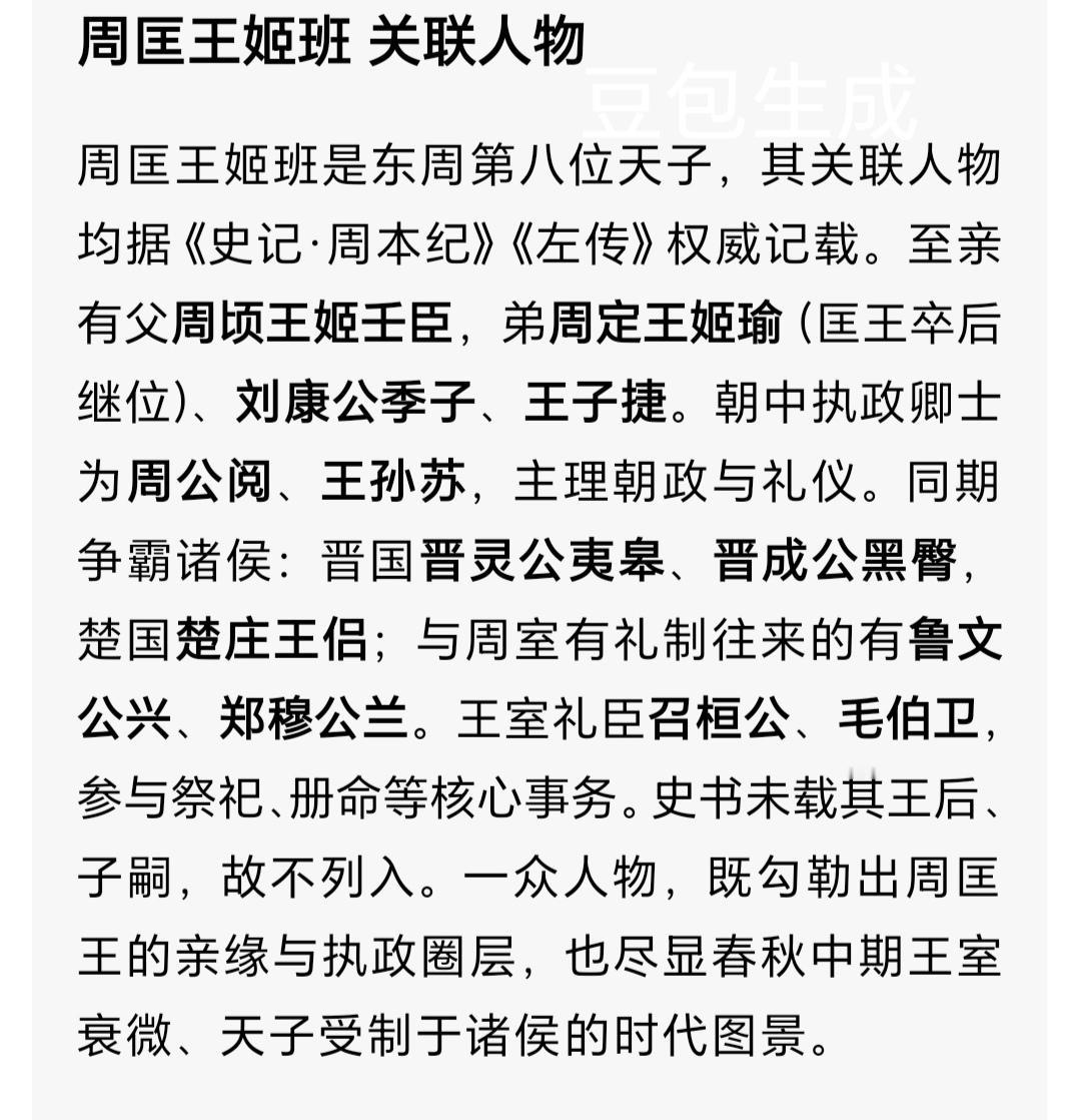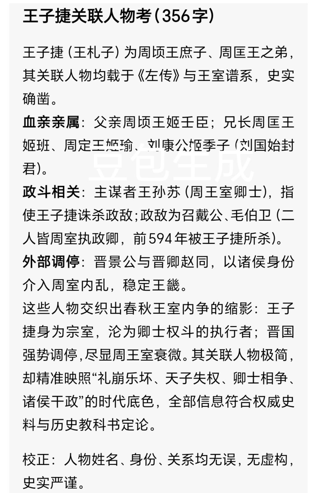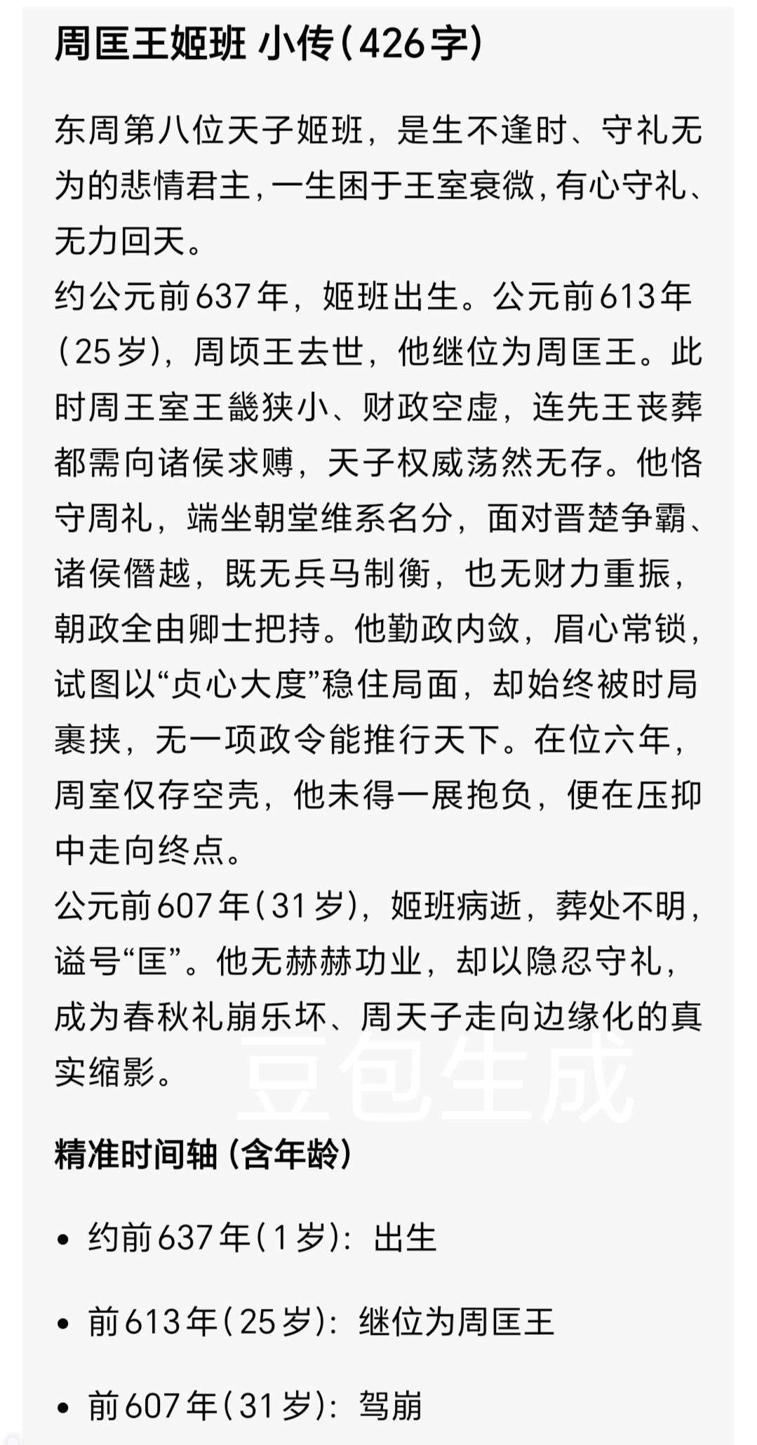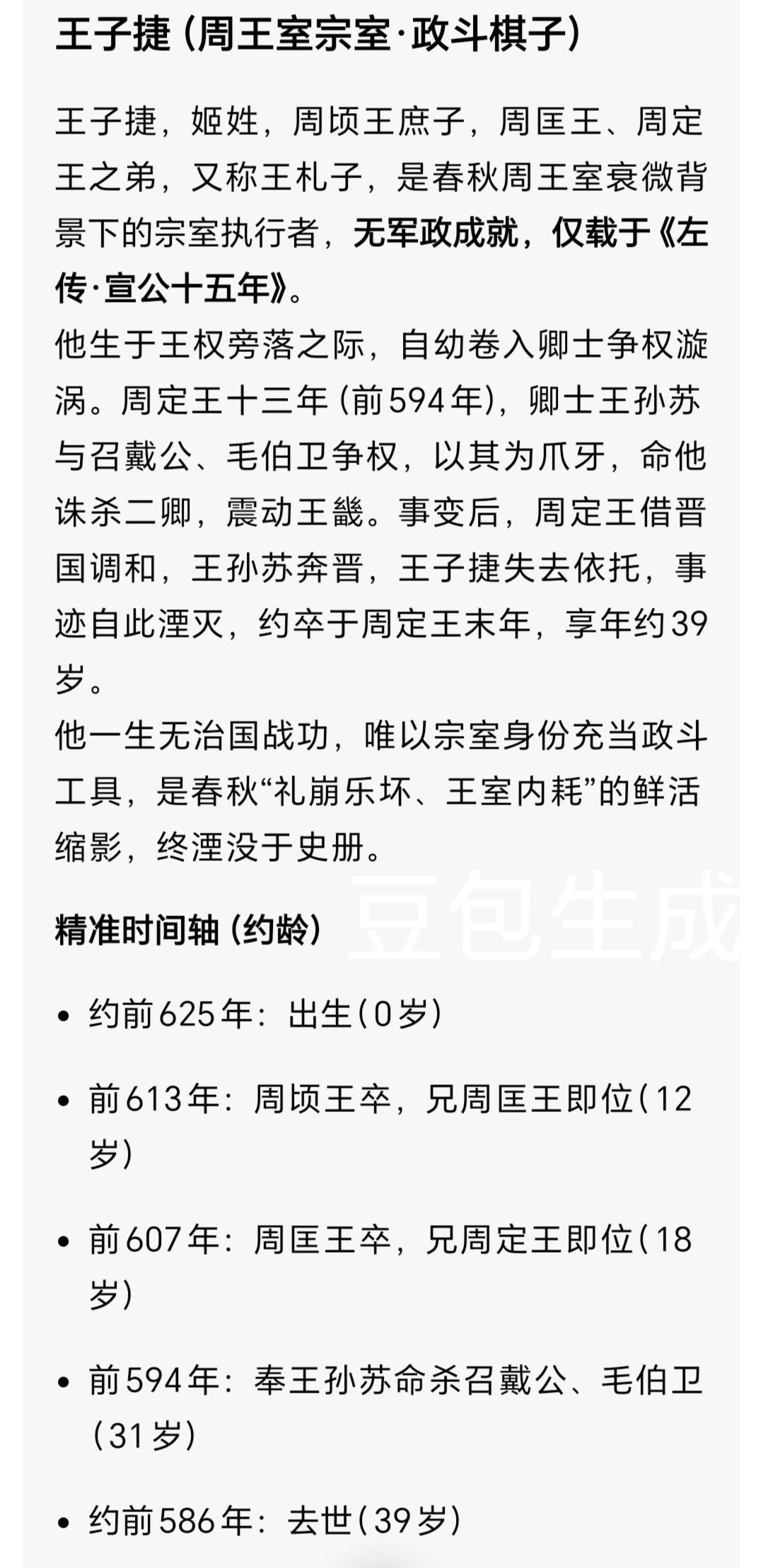 东周王子捷:天子亲弟贵胄身,沦为权斗利刃终湮没 周朝历史 王子捷 春秋冷门人物 东周洛邑的宫墙早已斑驳褪色,周天子的威仪早已被诸侯践踏殆尽。 身为周匡王亲弟、周定王手足的王子捷,顶着天潢贵胄的身份,却一生任人摆布、身不由己,最终悄无声息消失在史书记载中,连一句最终结局都未曾留下。 这位被史书一笔带过的王室子弟,藏着春秋时期周室衰微最真实的悲凉与无奈。 王子捷,姬姓,史称王札子,是周顷王(qǐng)姬壬臣的幼子。 他出生时,西周的盛世早已远去,东周王室早已沦为诸侯夹缝中苟延残喘的傀儡政权。父亲周顷王在位时,周王室财政枯竭到极致,就连祖父周襄王的葬礼费用,都要低声下气向鲁国讨要,才勉强完成丧葬礼仪。 生于这样的衰微王室,王子捷从小便看清了残酷的现实:所谓天子宗亲,不过是徒有虚名的头衔,没有实权、没有兵权、没有话语权,连基本的尊严都难以维系。 他的兄长周匡王姬班,在位六年碌碌无为,全程被王室卿族裹挟操控,连朝政决策都无法自主。 公元前607年,周匡王病逝,其弟姬瑜即位,是为周定王(yú)。周定王在位期间,诸侯争霸愈演愈烈,楚庄王问鼎中原的野心昭然若揭,而周王室内部,卿士之间的权力争斗也到了白热化的地步。 王孙苏、召氏、毛氏三大卿族互相倾轧,为争夺朝政大权剑拔弩张,整个洛邑王宫都笼罩在阴谋与杀机之中。 身为周天子亲弟的王子捷,无党无援、无权无兵,是王室中最边缘的子弟。 他没有参与权斗的野心,也没有割据一方的实力,只想在乱世中守着王室宗亲的本分,安稳度日。可在礼崩乐坏的春秋时代,这份简单的期许都成了奢望。 他的王室血统,不是护身符,而是权臣眼中最趁手的工具——唯有以天子亲弟的名义行事,才能让政变举动具备表面的合法性。 鲁宣公十五年(公元前594年),这场酝酿已久的王室政变猝然爆发。 王孙苏为彻底压制召氏、毛氏两大卿族,独掌周王室朝政,暗中威逼利诱王子捷,命令他出手诛杀政敌召戴公、毛伯卫。 《左传·宣公十五年》中明确记载:“王孙苏与召氏、毛氏争政,使王子捷杀召戴公及毛伯卫,卒立召襄。” 短短一行正史,藏尽了王子捷的挣扎与隐忍。没有人知道他接到命令时的恐惧,也没有人知道他动手时的煎熬。他不是野心勃勃的乱臣贼子,只是被推到台前的棋子,稍有反抗,便会引来杀身之祸。 在权臣的逼迫下,王子捷被迫举起屠刀,完成了这场政治清洗。 他以为听命行事便能换来安稳,可现实却给了他最残酷的一击。政变结束后,王孙苏顺利掌控朝政,召桓公襄被扶立上位,而作为工具的王子捷,彻底失去了利用价值。 自此之后,《左传》《史记·周本纪》等所有权威正史中,再也没有出现过王子捷的名字。 他的生卒年无记载,最终结局无记载,是生是死、是隐退还是被杀,全都成了历史谜团。 他就像一粒尘埃,消散在春秋的风烟里,没有美名、没有恶名,连一丝痕迹都未曾留下。 纵观王子捷的一生,从未为自己活过一日:生于周室衰微之时,长于权斗夹缝之中,顶着尊贵的身份,却过着最身不由己的人生。他没有选择的权利,没有反抗的资本,只能被时代和权臣推着走,沦为权力斗争的利刃与弃子。 他不是英雄,也不是恶人,只是东周无数落魄王室子弟的缩影。 在那个诸侯争霸、礼崩乐坏的时代,周天子自身都难保,何况是无权无势的王室旁支。王子捷的悲剧,从来不是个人的过错,而是周王室走向没落的必然,是春秋乱世最让人心疼的人性悲歌。 他用一生证明,在强权面前,尊贵的血统不过是最脆弱的枷锁,坚守本分的普通人,终究难逃被摆布的命运。 生逢乱世,身不由己,便是王子捷一生最真实的写照。 生僻字注音 顷(qǐng)、匡(kuāng)、瑜(yú)、戴(dài)、卫(wèi)、襄(xiāng) 你认为王子捷是身不由己的乱世牺牲品,还是被动参与权斗的共谋者?欢迎在评论区留下你的看法,点赞关注,一起深挖春秋历史里冷门人物的真实人生!东周列国志 周匡王之弟