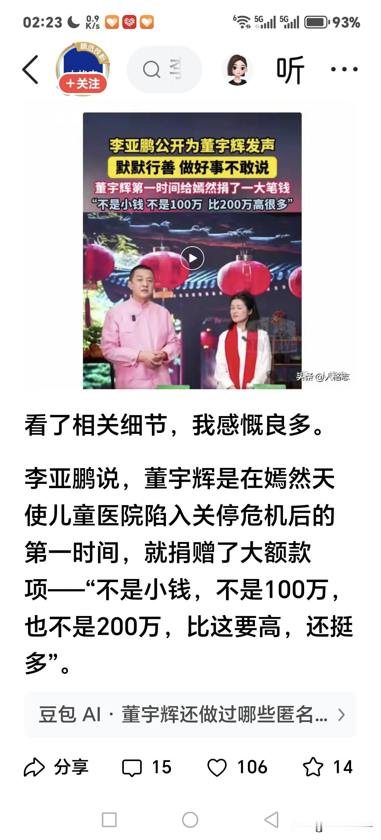 董宇辉执着于“行善的意义,不在于外界的评价”。他做事像极《法华经》里的善慧。善慧一生慈悲待人,扶贫助人,照顾病弱,德行高尚。然而,本应是楷模的他,却屡遭不公。被人诬陷与富商之女有染、被诽谤品行不端,被人栽赃曾下毒害人,导致声名狼藉,众叛亲离。 佛陀为其指点迷津,“善慧,你一生所遭遇的一切陷害与诋毁,皆因你前世恶口妒贤、诋毁无辜所造恶业的果报”。 善慧经过佛陀的点化,悟出行善真谛: 以善心面对逆境,在遭遇诋毁、抹黑、陷害、不公时,选择包容沉默、忍耐与继续行善。最终,他通过了神界考验,得以修成正果。 这个故事启示: “好人受委屈”时,要谨记“行善的意义,不在于外界的评价,而在于牢记行善之初心,不被世俗偏见、加害与诋毁所困扰。 当下的董宇辉面对网络黑粉的质疑、诋毁何尝不是如此?在面对恶意抹黑的情况,仍然捐款嫣然基金,为奉节几百位65岁以上老人送去羽绒服等过冬急需物品。这是何等的难能可贵啊,难道董宇辉真是善慧转世?董宇辉 董宇辉金句良言 董宇辉进藏 董宇辉定律 对董宇辉