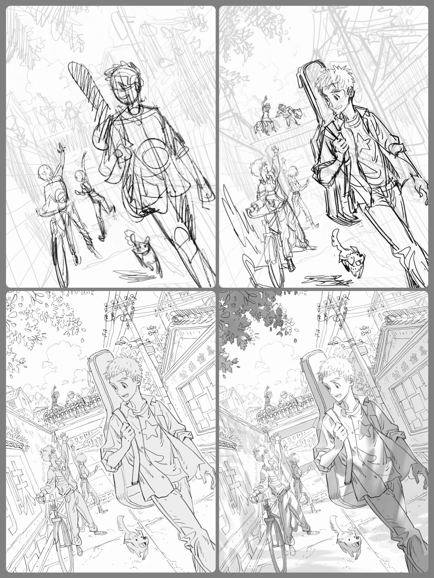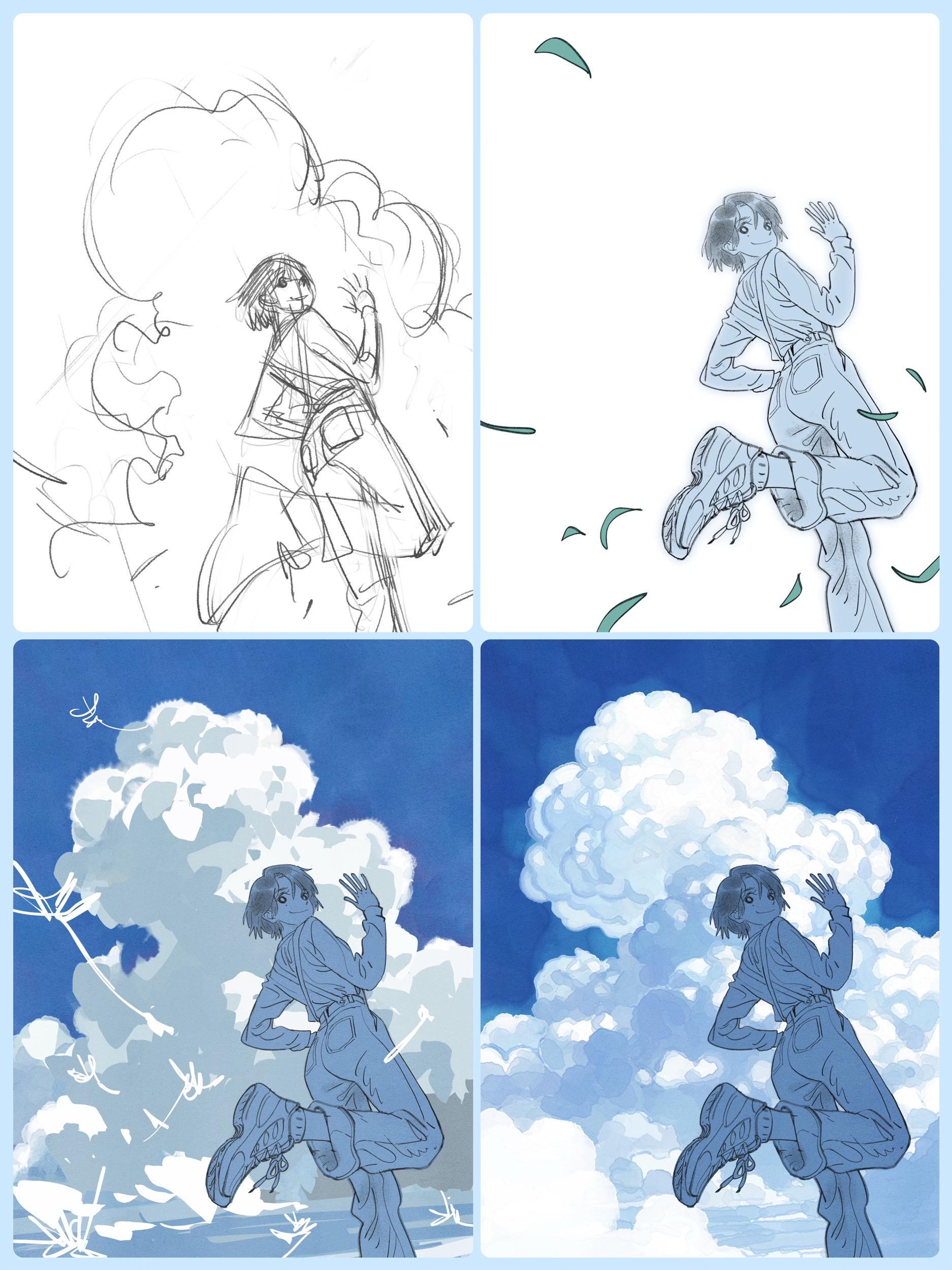 那天阳光正好☀️。最近为我的原创漫画《昨日青空:印刻流年》画的两张扉页和创作过程截图。 过程中的每一遍重新构建,都是一个深入了解自己的过程。