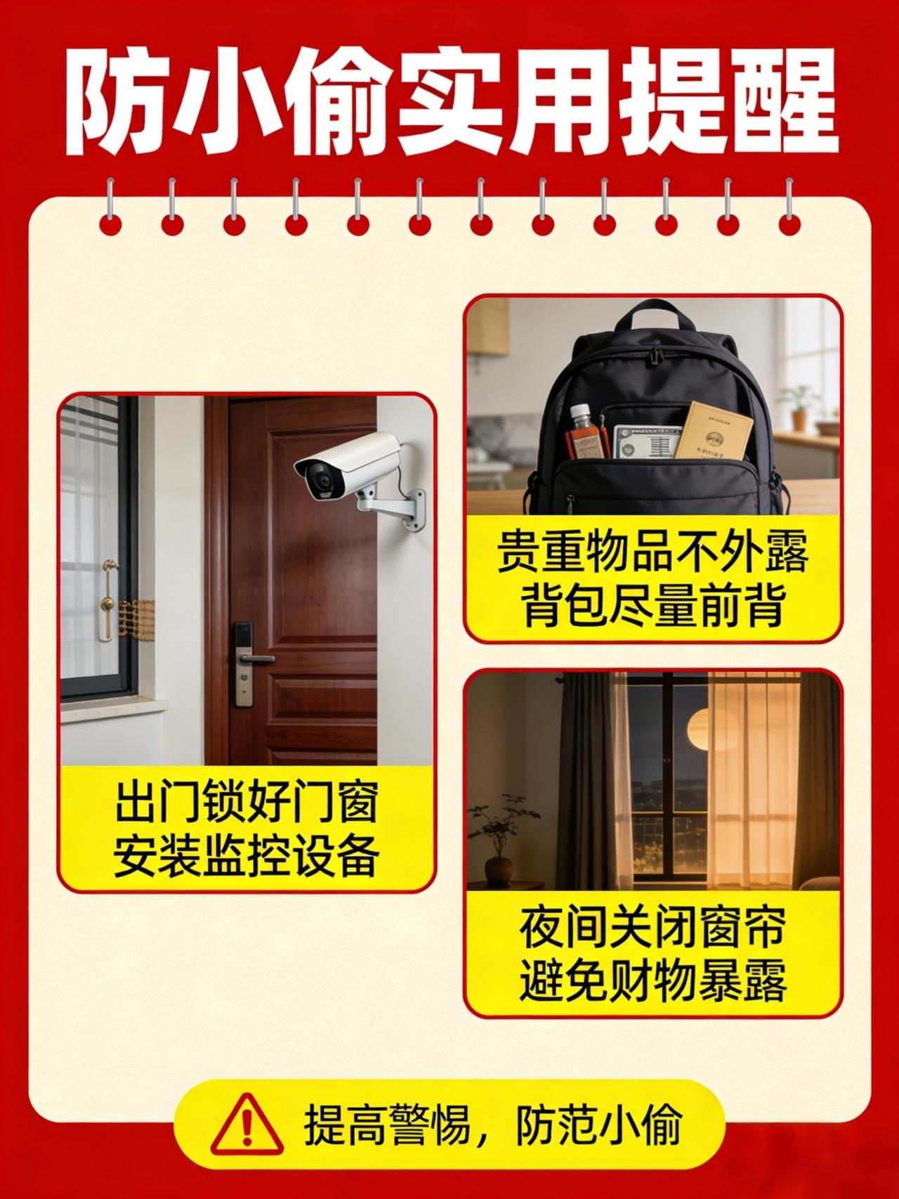 年底防盗提醒!这5个习惯一定要改,别给小偷可乘之机 年关将近,小偷也开始“冲业绩”,出门、在家都得多留个心眼! 1. 出门必反锁门窗,别嫌麻烦,单靠碰锁一撬就开 2. 门口别堆快递盒、外卖单,暴露独居/常不在家 3. 长期不在家,让邻居帮忙收报纸、开下灯 4. 电动车、电瓶车停有人看守处,锁好车头+车轮锁 5. 家中不放大量现金,贵重物品藏隐蔽处 平安过年比啥都强,多一分警惕,少一分损失! 转发提醒家人朋友,守住自家平安~ 年底防盗 安全提醒