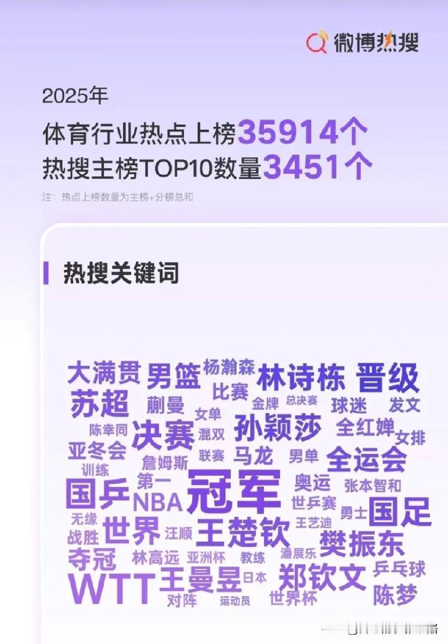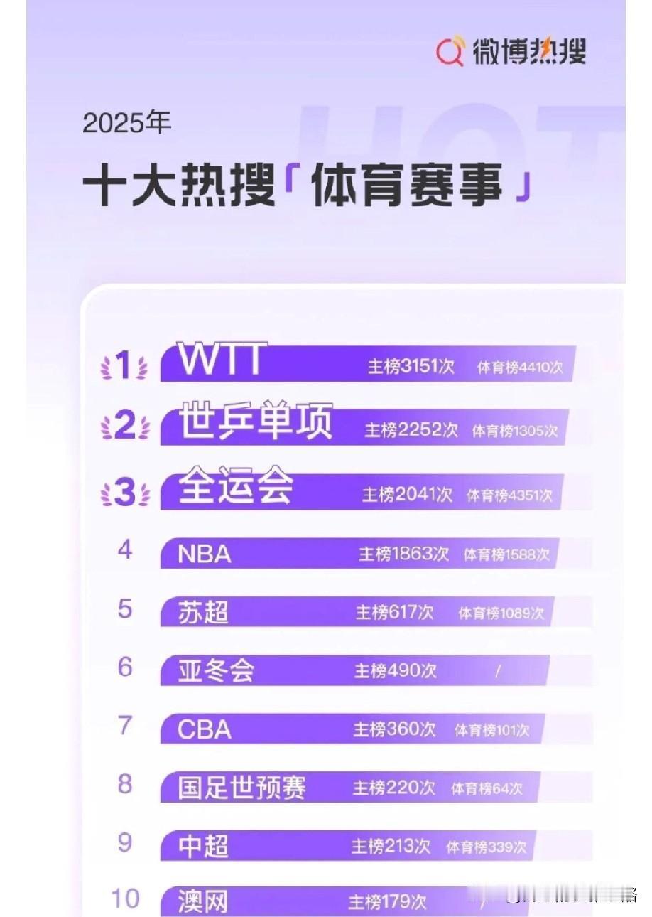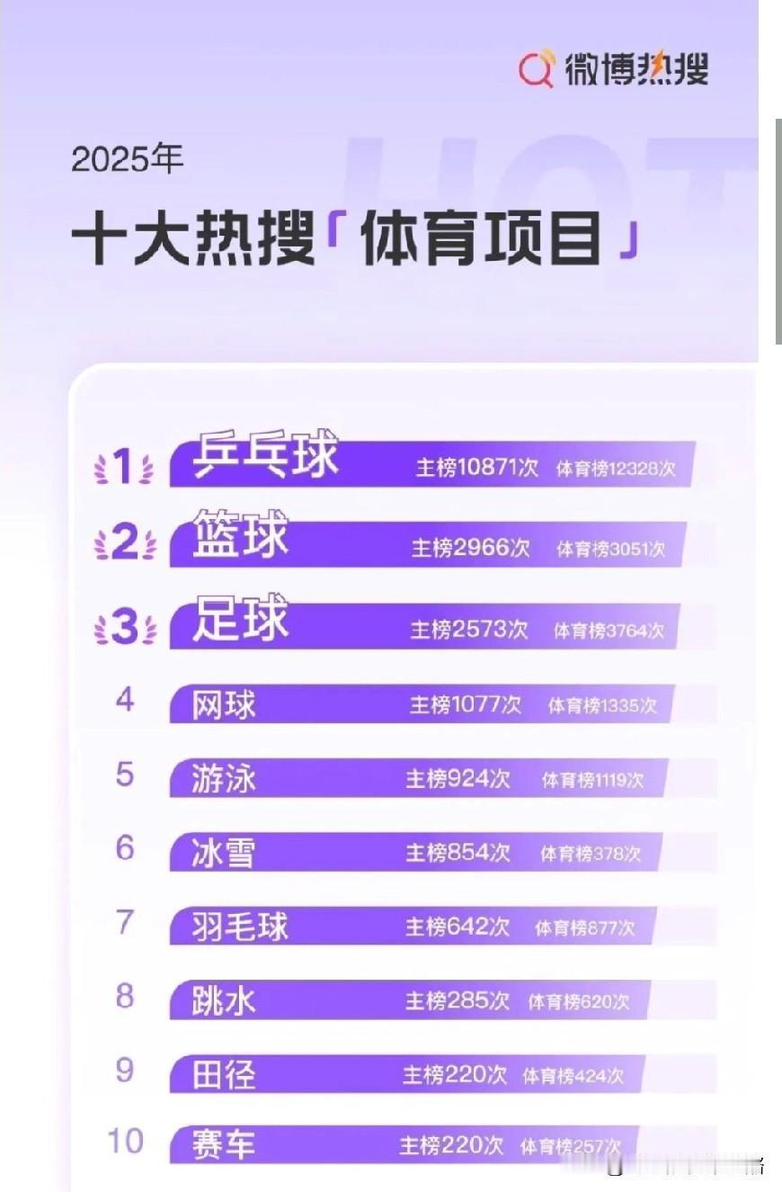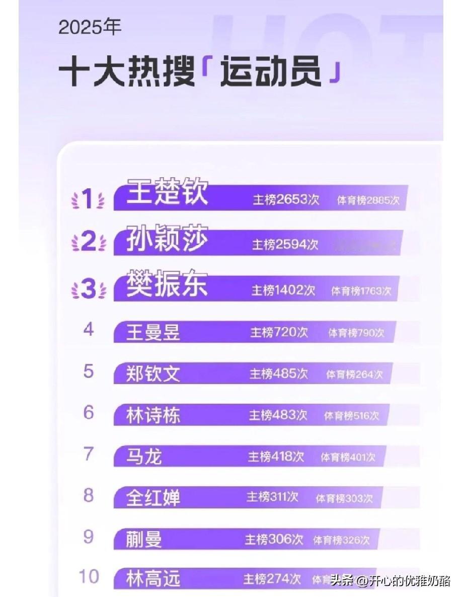 国乒队员上热搜榜,乒乓球更是微博热搜榜一。 乒乓球是体育项目热搜榜一,十大微博热搜运动员,国乒就占8位,王楚钦、孙颖莎、樊振东、王曼昱、林诗栋、马龙、蒯曼、林高远,以上队员都自带流量,频频上热搜。 此外,大满贯、冠军、WTT、世乒赛、国乒、也都是热搜关键词。 由此可见乒乓球真是国球,全国人民的喜爱程度可见一斑。 乒乓球项目及相关运动员,在2025年的关注度和影响力空前绝后。 尽管现在的国乒还不是盛世,但依然是大众最喜欢的赛事。 中国队加油,不负众望砥砺前行。 图片来自网络侵权可删。