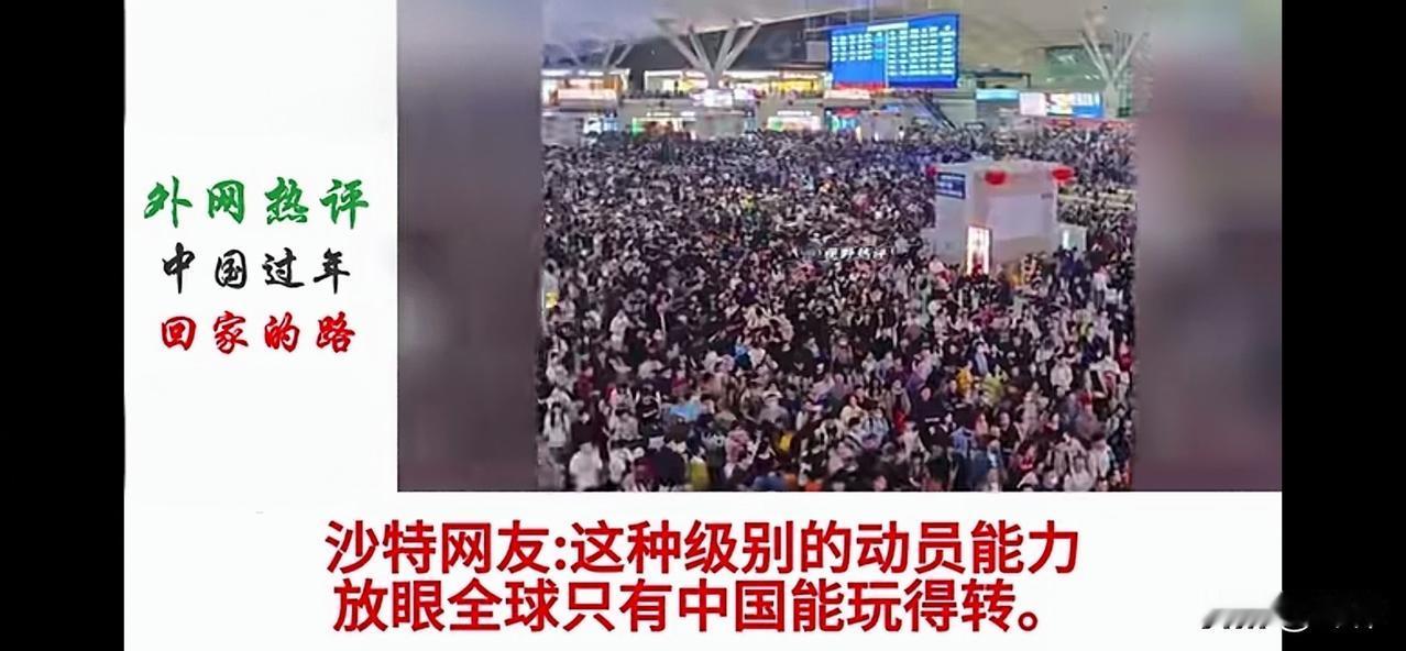 外网:中国过年回家的路就是人类文明的归途和人类文明的根,也是人类未来再出发的路。 美国网友:太震撼了!40天95亿人次还能这么稳和井然有序,也就中国能做到,换我们系统早崩了。 智利网友:上帝呀,40天95亿人次同时出行和旅游,这比全世界总人口还要多!果然是能再造一个地球的人类第1强国。 德国网友:这么大的车流量还能保持井然有序,也就中国能做到。 澳洲网友:95亿人次同时流动还能保持井然有序?!显而易见,中国的一切都达到了其他任何国家连想都不敢想的高度。 日本网友:高速服务区都有热饭和充电,我们真该好好学学怎么服务旅客。 日本网友:不过20个日本加在一起也达不到中国完美应对40天95亿人次同时流动的王者能量。 沙特网友:这种级别的动员能力和保障能力,放眼全球,只有中国能玩的转。 土库曼斯坦网友:随便提到一个领域,全球都在共同见证:中国的强大是超越人类历史和超越其他所有国家总和的强大。 新加坡网友:我们也过年,但没中国“必须回家”的执念,这传承太绝了。 新加坡网友:作为拥有中华血统的新加坡,我们没有“回家过年”的执念?那是因为我们本身就是一个城市国家,下班回家的路就是我们“返乡”的路。 新加坡网友:新加坡的故乡是中国。大多数新加坡人都是龙的传人,越来越多的新加坡人奔向中国过年,因为那里是我们的根和我们的本。 南非网友:当我看到视频里一辆被追尾变形的车辆像英雄一样即使带着伤也要不懈地奔向家的方向,我被感动得泪水打湿了手机屏幕。 泰国网友:这就是中华文明生生不息的原因,强烈的家国情怀太打动人。 秘鲁网友:中国人的家国情怀就是人类文明的根,中国人回家过年的路就是人类文明的归途和人类未来再出发的路。 俄罗斯网友:你们回家过年,我们去中国过年,主打一个双向奔赴。 俄罗斯网友:我现在就在中国,我发现俄罗斯人来华过年的热情太燃了,乌泱乌泱的俄罗斯游客甚至提早一周时间就迫不及待地投入到中华盛世的怀抱,包括我在内的每一位俄罗斯游客的眼里满满都是对中国的热爱和向往。 乌拉圭网友:真是人类历史上前所未有的壮观!从排队访华热潮到追随中国的队伍一眼望不到头,中国春节和中华盛世像地心引力一样吸引着全世界。中国越来越成为全人类共同的祖国。 瑞士网友:把这么多人安全送回家,是系统工程的奇迹。中国本身就是人类最大的奇迹。 印度网友:同样作为14亿人口的大国,与每天都在创造奇迹的中国相比,我们印度没有一样能拿得出手的东西。 加拿大网友:当我看到各种角度拍摄的中国春运视频时,毫无疑问,中国在基础设施、民生保障能力、组织动员能力、科技应用能力和工业产能等所有领域都达到了超过其他所有国家总和的实力。 玻利维亚网友:中国春运视频里的城市和基础设施实在是太先进了,这哪里是发展中国家?这分明是全世界第一发达国家。 韩国网友:天大的笑话,哪个发展中国家能有独立的空间站、航母、产量占全球80%以上的无人机、最强AI、6代机、全球在轨卫星数量最多的北斗卫星导航系统…… 韩国网友:哪个发展中国家能有领先美国10~20年的直流电磁弹射系统、嫦娥6号月背采样返回任务、钍基熔盐反应堆、超导量子计算机、光量子计算机、量子卫星、6G卫星、天算卫星、太空电站、天基微波传输系统、亿度千秒人造太阳和可控核聚变发电计划…… 韩国网友:哪个发展中国家能有世界第一的人均蛋白质供应量(1000万人口以上国家排名)和世界第一的人均住房拥有率…… 韩国网友:哪个发展中国家能生产全球25%的粮食、33%的水果、45%的禽蛋、50%的猪肉、60%以上的水产品、70%以上的蔬菜和80%以上的设施农业农产品,哪个发展中国家能像中国这样保障14亿人口充分享受到上述所有农产品的自由? 韩国网友:哪个发展中国家能研制出能对美国形成降维性打击和碾压式领先的海啸般科幻装备:从鹰击系列高超音速反舰导弹到东风系列高超音速弹道导弹…… 韩国网友:从龙吟七型粒子束武器到亚轨道轰炸机,从每分钟45万发的暴雨梨花针近防系统到九天空中无人机航母,从红旗29陆基中段反导系统到覆盖全球的东风61和东风5C…… 韩国网友:从空警3000预警机到神雕天眼预警无人机,从MD22临近空间高超音速宽域飞行器到无侦8,从旋转爆震发动机和斜爆震发动机到一系列无比科幻和无比先进的忠诚僚机和大型制空无人战机…… 韩国网友:从等离子隐身技术到量子雷达……哪个发展中国家能像中国这样拥有像上帝一样俯瞰世界的有人作战体系和无人作战体系,哪个发展中国家的实际工业产能超过了全球其他所有国家的总和。 土耳其网友:天呐!我试图数清韩国网友所列举的和遥遥领先的中国科技成就,结果我不得不放弃了这种尝试,因为根本就数不清。 塞尔维亚网友:中国的伟大已经无法用任何已有的标准来衡量,去中国吧,否则那将是你一生最大的遗憾。