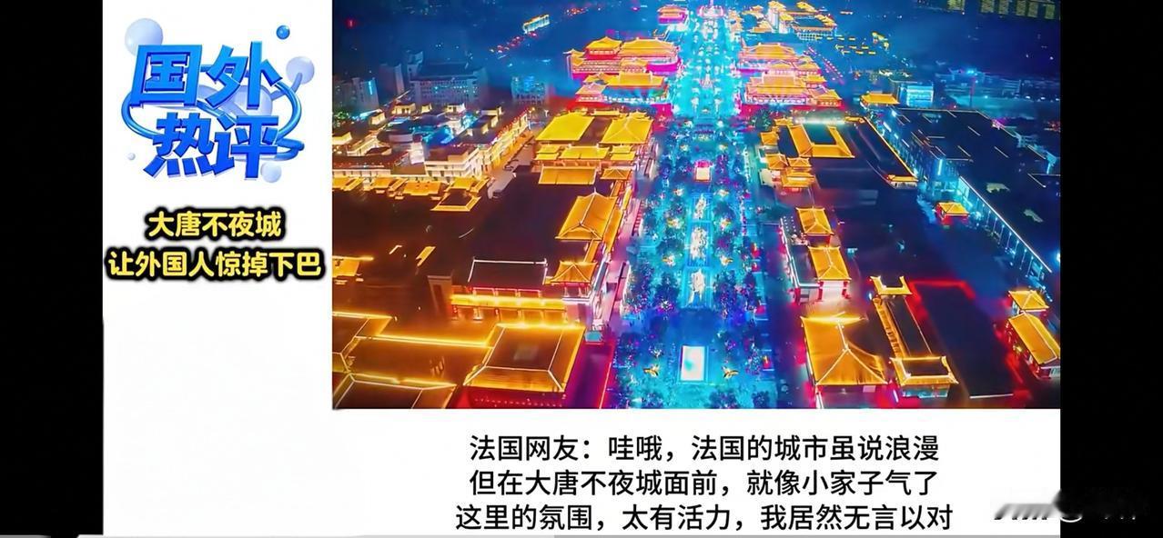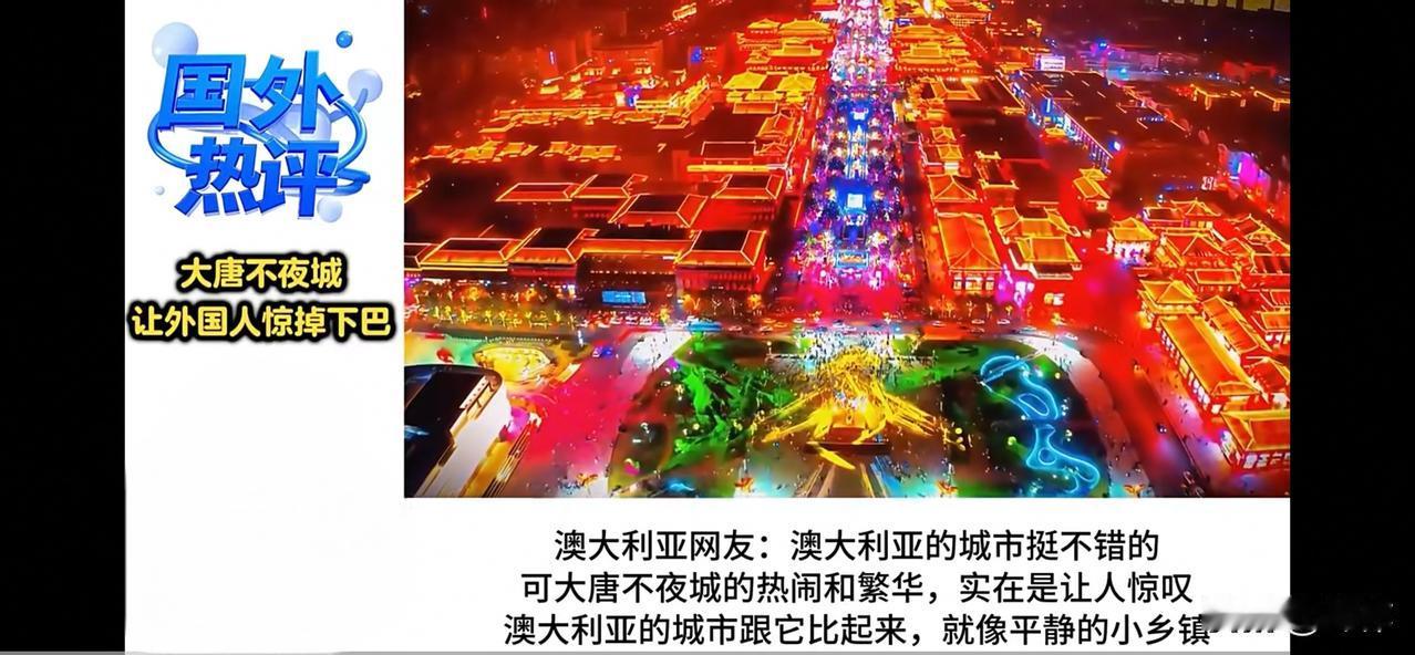 外网:中华盛世简直是把星河搬到了人间。人类的一切美好尽在中华盛世。 马来西亚网友:马上就到马年春节了。看着星际启航般的中国春运和灿若星河般的返乡车流,中华盛世让所有海外华人热血沸腾。 英国网友:人类文明的所有核心价值和所有美好元素尽在中华盛世!中国的文化底蕴和中国的先进发达让全世界羡慕和仰望。 越南网友:从西安大唐不夜城到哈尔滨冰雪大世界,从全球最大的海南离岛免税区到多姿多彩的西双版纳民族风情…… 越南网友:从梦幻重庆到天府成都,从吉林雾凇到上海外滩……9天春节假期,中华盛世的每一处胜景都将迎来更大规模和震撼世界的滚滚车流和滚滚客流。 葡萄牙网友:眼见为实,对于我们这些西方游客来说,中华盛世之美只有梦里才有。人类的一切美好尽在中华盛世。 意大利网友:所有西方游客都渴望能延长免签天数,因为根本就不够用啊,中华盛世的每一个角落都值得我们把沉醉的心停留。 尼日利亚网友:我在中国,看看古都西安和大唐不夜城,难以想象人类文明在几千年前就达到了如此高度! 斯洛文尼亚网友:我现在越来越有理由确信,华夏文明是人类文明的摇篮和母亲。 阿根廷网友:哇!当我看到西安大唐不夜城的视频,我简直不敢相信世界上怎会有如此璀璨和如此恢弘的历史文化和建筑艺术! 日本网友:啊……这大唐不夜城真的太棒了!和我梦中的仙境有得一比,如果我们成了他们的一个省,是不是可以免费看现场了。 尼泊尔网友:比珠穆朗玛峰还高的民族,比星河还璀璨的中华文明,比苍穹还辽阔的王者胸怀和王者格局。最伟大的中国,请接受来自尼泊尔跨越千年的热爱。 西班牙网友:这大唐不夜城的景致也太震撼了!和他一比,我们的街道简直像乡下小路。 西班牙网友:中华盛世简直是把星河搬到了人间,我一定要去,因为那里不仅是人类文明的中心,更是人类的未来。 德国网友:上帝呀!我们德国的街道在它面前宛如简陋的小街巷,这是东方的梦幻之地! 法国网友:哇,法国的城市虽说浪漫,但在大唐不夜城面前,就像小家子气了,这里的氛围太有震撼力了,我居然无言以对。 摩洛哥网友:现在的法国城市还称得上浪漫吗?遍地垃圾和涂鸦,明目张胆的小偷和毒贩到处游荡…巴黎的公厕数量甚至比白犀牛还要稀少。 澳洲网友:我原本以为澳大利亚的城市就挺不错的,可中国城市的先进繁华和文化底蕴完全处于碾压任何国家城市的另一个维度,实在是令人惊叹。 澳洲网友:澳大利亚的城市跟中国城市相比,就像偏僻的小乡镇。 德国网友:去了一次中国才知道我们这些自称为发达国家的有可笑。 澳洲网友:我的眼睛快被亮瞎了!突然觉得悉尼变得土里土气,这就是传说中的中国?不愧是贯穿人类历史和缔造人类未来的第1强国! 俄罗斯网友:在大唐不夜城面前,我们莫斯科红场黯然失色,这简直是人类文明的璀璨明珠! 巴西网友:从中华盛世到科技大爆发,从民生保障能力到主导一切的中国制造,从海洋到太空,中国的一切都站在世界最高处。 乌拉圭网友:怪不得包括欧洲和乌拉圭在内的世界各国蜂拥访华,这是文明的回归,或者说这是世界各国回归到人类文明的母亲怀抱。 新加坡网友:我们的祖先都是华人。先辈们出来的时候,我们还很贫穷,没想到几十年发展得这么快。 新加坡网友:这才几十年时间,伟大祖国就重新回到了人类第1强国的历史地位。 新加坡网友:从建国时的一穷二白到如今在所有领域都崛起为全球仰望的世界领袖。 新加坡网友:76年的砥砺征程和几十年如一日的艰苦奋斗,来之不易的中华盛世让我们这些海外华人热泪盈眶。