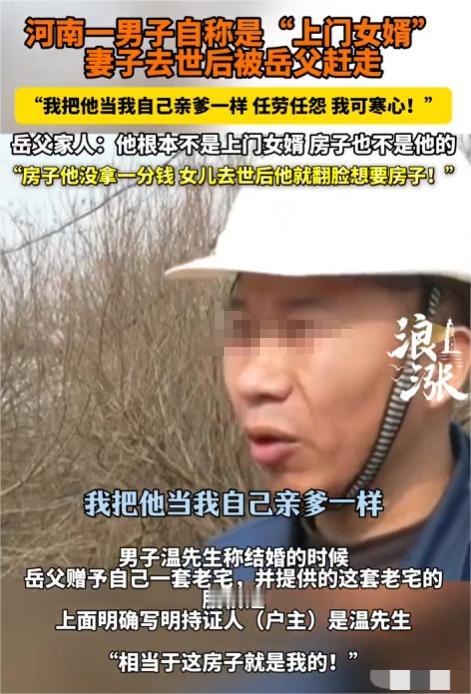 河南平顶山,一42岁男子作为上门女婿,妻子因乳腺癌离世,上午办完葬礼,下午就被岳父和12岁儿子赶出家门,房子门还被焊死。男子崩溃称付出17年,房子该归自己。岳父却否认招过上门女婿,让他拿文件证明。双方各执一词,记者介入调查,最终村委证明房子归属岳父,男子并非上门女婿,真相令人意外。 “这是我们家的房子,凭什么给你一个外人!”岳父脱口而出的一句话,让温先生的心凉透了。2025年11月9日,温先生刚刚含泪送走亡妻,整个人还没缓过劲来,就被岳父扫地出门,而且手段及其强硬。 岳父直接把房门焊死,门口还贴了张纸:“禁止入内”。可怜温先生站在寒风里,手里攥着一张写有自己名字的股权证,却再也进不了那个住了十七年的院子。 温先生说,自己是上门女婿,当年因为没房,才入赘到这家。婚后和妻子一起生活、共同照顾岳父母、孩子也在这屋檐下长大。 妻子患乳腺癌三年,他卖车、借钱、日夜陪护,直到送她走完最后一程。可没想到,葬礼刚结束,岳父就翻了脸,连12岁的儿子都被拉走,不让他靠近。 温先生不甘心,觉得这房子自己住了十来年年,修过屋顶、垒过院墙,怎么就成了“外人”? 他拿出那张农村股权证,上面清清楚楚写着他的名字,以为这就是“房产证明”。可村委后来解释,那只是集体经济成员的身份凭证,跟房子产权一点关系都没有。 更关键的是,村里人都知道,女方家本来就有儿子,按当地老规矩,“有儿不招婿”,根本不可能正式招上门女婿。 而且,温先生和妻子的孩子随父姓,户口也是独立迁入,并未并入岳父家庭。这些细节,在情感上或许显得冷冰冰,但在法律和村规面前,却是决定性的事实。 记者介入后,村委会出具了书面说明:房子是岳父早年自建,产权明确归他所有;温先生只是曾借住,并非法律或习俗意义上的上门女婿。 这一纸证明,让原本一边倒同情温先生的网友开始重新思考:农村有太多事靠口头约定,可一旦出事,就会出现这种“公说公有理婆说婆有理”的情况。 其实,这件事最扎心的地方,不是谁对谁错,而是人情和规则撞在一起时,往往两败俱伤。温先生的委屈是真的,他把最好的年华给了这个家,却在最脆弱的时候被拒之门外。 可岳父的坚持也有依据:房子是他建的,儿子还在,凭什么让一个没有法律身份的女婿占着? 值得欣慰的是,事情最后没走到撕破脸的地步。在村干部和媒体调解下,双方总算达成了和解:温先生不再坚持要房子,岳父一家也答应让他收拾东西离开。毕竟孩子还在呢,总归还是一家人。 温先生的遭遇不是个例,尤其是在农村地区,宅基地、老宅、赡养等问题盘根错节,提前说清楚、留个字据,不是为了算计,而是为了守护那份来之不易的安稳。 对此你有什么看法?欢迎在评论区留言讨论。上门女婿 信息来源: 浪潮新闻、小莉帮忙 文|墨海 编辑|史叔